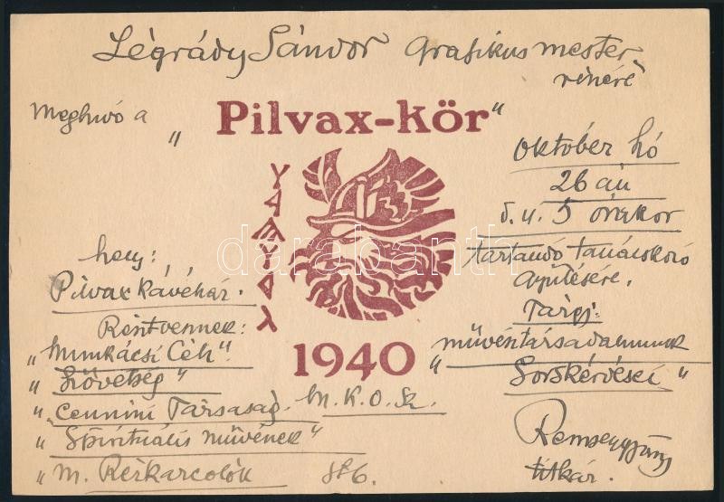 1940 Remsey [Jenő] György (1885-1980)festőművész, grafikus, lapszerkesztő, író autográf sorai, aláírásával a Pilvax-Kör 1940. október 26.-án tartandó tanácskozására, Légrády Sándor (1906-1987) festőművész, grafikus részére.