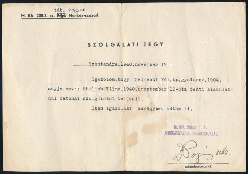 1940 Szentendre, munkásszázadnál katonai szolgálatot igazoló szolgálati jegy, Selmeczi Pál karpaszományos gyalogos részére, M. Kir. 208/3. T[ábori] V[egyes] Munkásszázad Parancsokság, fejléces papíron, pecséttel, századparancsoki aláírással, foltos.