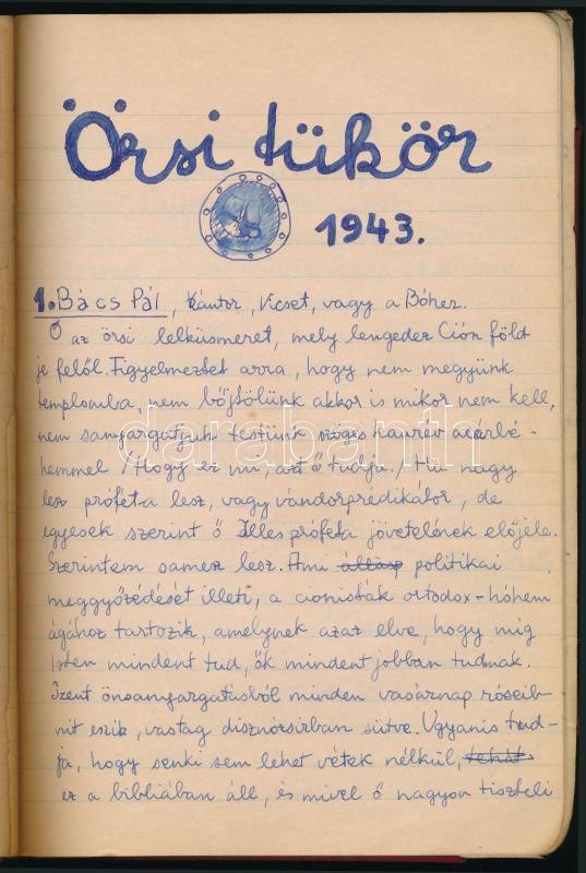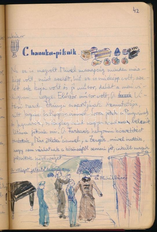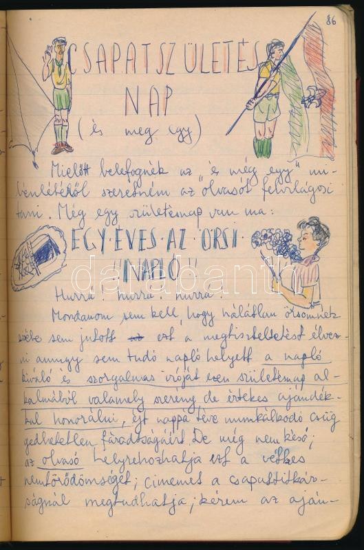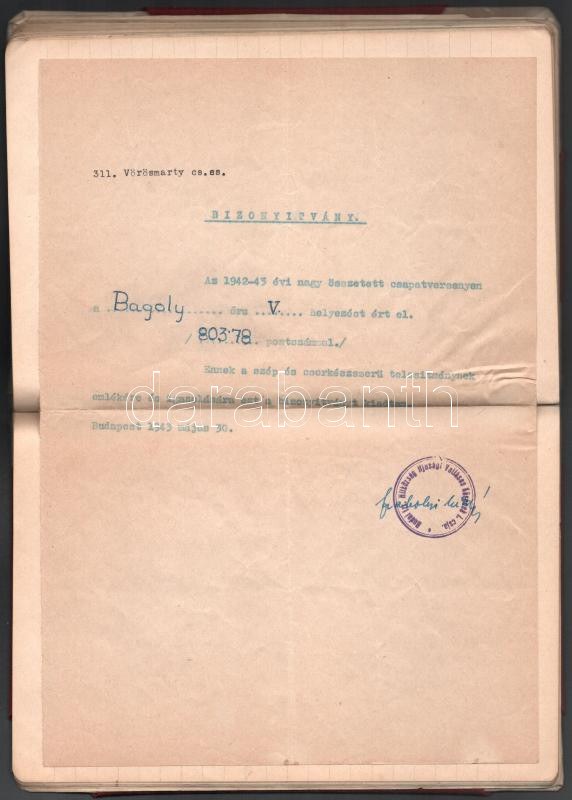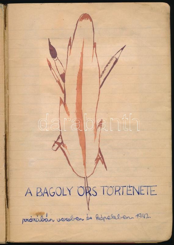 1942-1943 "A Bagoly Örs Története prózában, versben és képekben", a [Budai Izraelita Hitközség] 311. Vörösmarty cserkészcsapata Bagoly Örsének cserkésznaplója. Kézzel írva, 2 fotóval, sok rajzzal, érdekes, vicces történetekkel, nevekkel, és beragasztott cserkészverseny bizonyítvánnyal (1942. V. helyezés), a Budai Izr. Hitközség Ifjúsági Vallásos Körének I. csoportja pecséttel, aláírással (Szabolcsi Miklós), 88+[23] p.