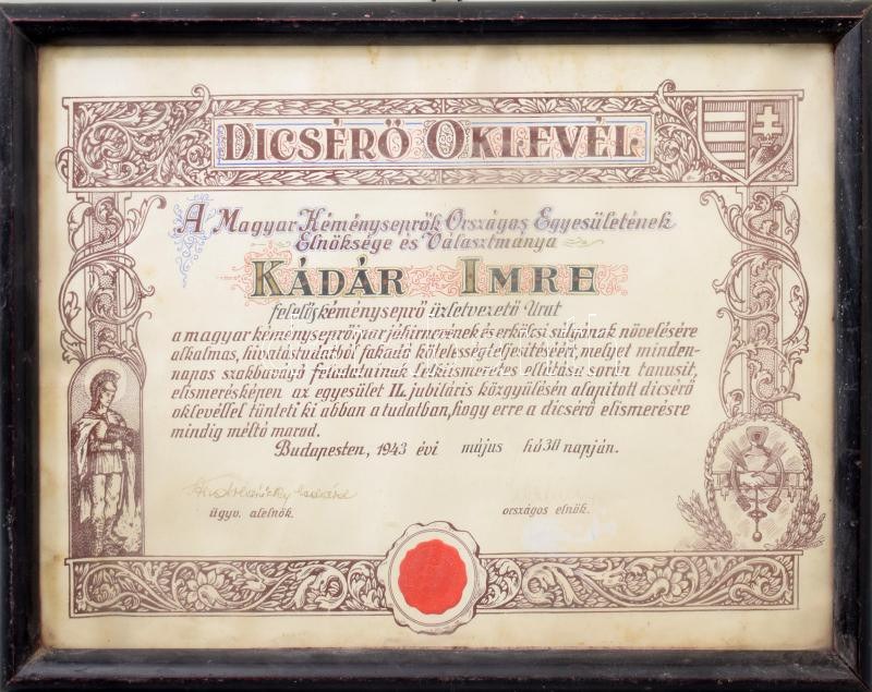 1943 Bp., A Magyar Kéményseprők Országos Egyesületének Elnöksége és Választmánya által kiállított dicsérő oklevél