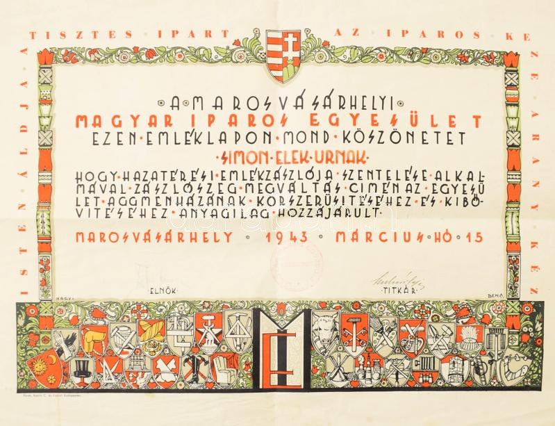 1943 Marosvásárhely, a Marosvásárhelyi Magyar Iparos Egyesület emléklapja Simon Elek csizmadia részére, a hazatérési emlékzászló szentelése alkalmával való hozzájárulásért, dekoratív grafikával. Hajtva, kis lapszéli sérülésekkel, kissé gyűrött, 41,5x33 cm