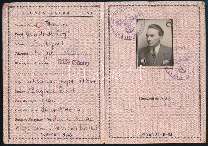 1943 Német Birodalom, magyar orvos részére kiállított ideiglenes fényképes igazolvány (vorläufiger Fremdenpass)