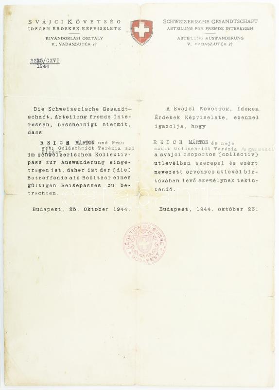 1944 Bp., a Svájci Követség által kiállított menlevél (Schutzpass) Reich Márton és családja részére, 1944. okt. 23.
