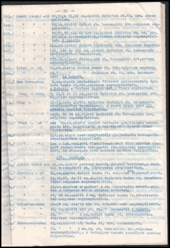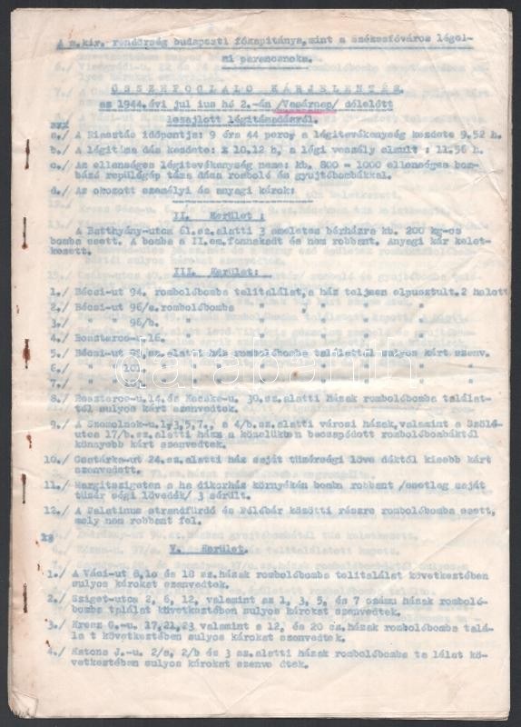 1944 Budapest elleni légitámadás utáni rendőrségi kárjelentés. Gépelt irat 16 p