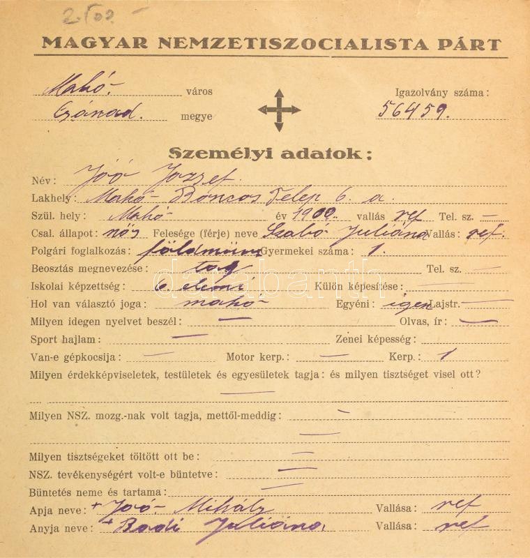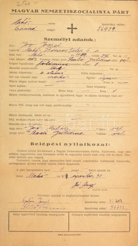 1944 Magyar Nemzetiszocialista Párt kitöltött belépési nyilatkozat