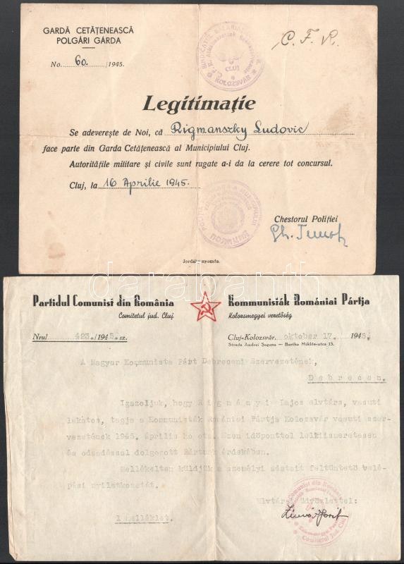 1945 Rigmányi Lajos kolozsvári vasuti lakatos, a Kommunisták Romániai Pártja 3 db igazolványa és 1 db rá vonatkozó levél, pecsétekkel, aláírásokkal, román és magyar nyelveken, 1945 április 16 - október 17.