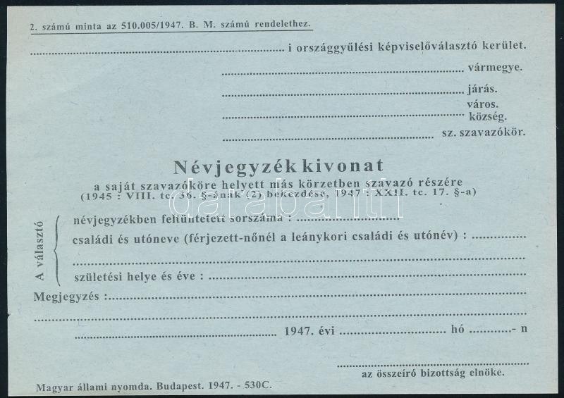 1947 A ,,kékcédulás választások" kitöltetlen cédulája (Névjegyzékkivonat / Szavazási űrlap), 14,5x10 cm