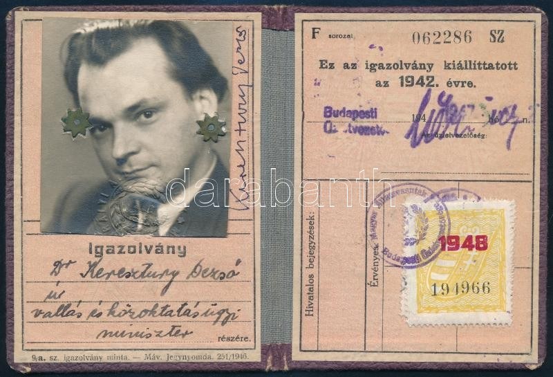 1947 Keresztury Dezső (1904-1996) vallás és közoktatásügyi miniszter fényképes MÁV igazolványa...