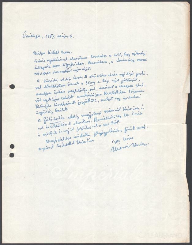 1951 Posillipo, Márai Sándor (1900-1989) író autográf levele, aláírásával, Molnár József (1918-2009) emigráns magyar író, könyvkiadó, nyomdász, a (Új) Látóhatár folyóirat és az Aurora Kiadó szerkesztője részére, dátumozva (1951., május 6.), a szélén két lyukkal.