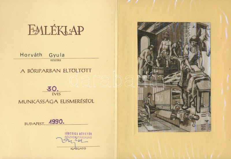 1990 Táncsics Bőrgyár Rt. emléklapja, a bőriparban eltöltött 30 éve tiszteletére, bőripari témájú illusztrációval...