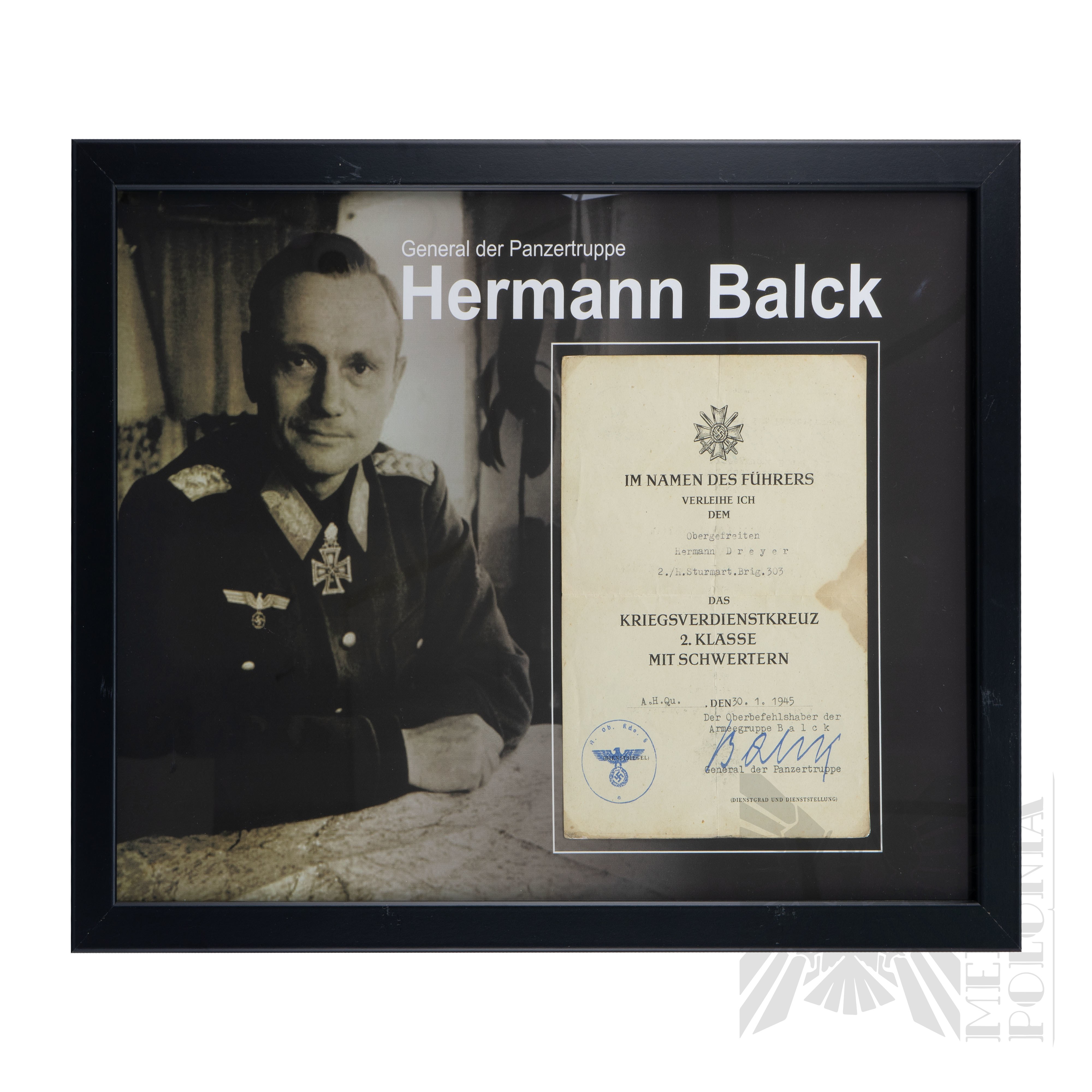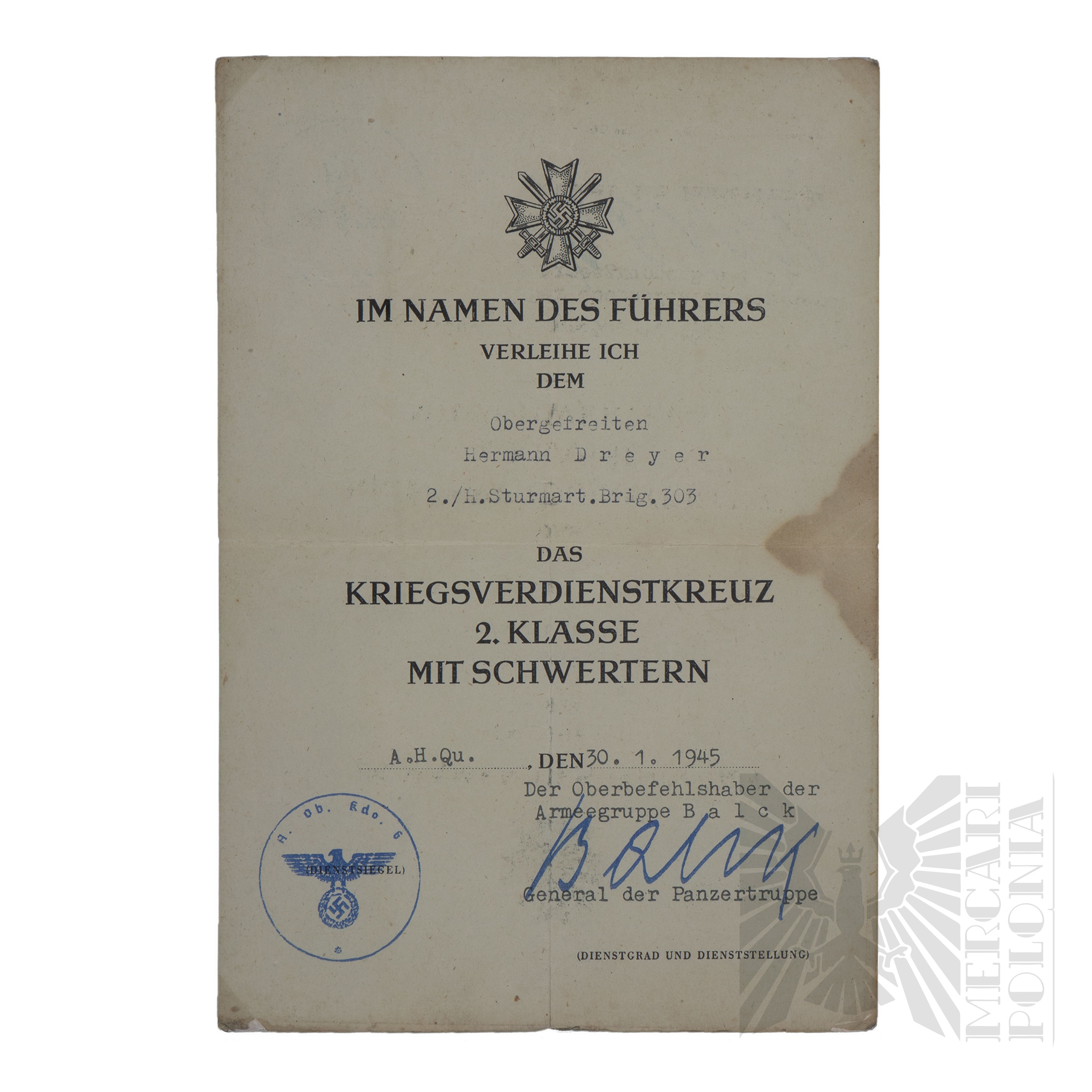 Dokument nadania KVK z mieczami 2 klasy z 30 stycznia 1945 roku, podpisany przez Generała Wojsk Pancernych Herman Balck.