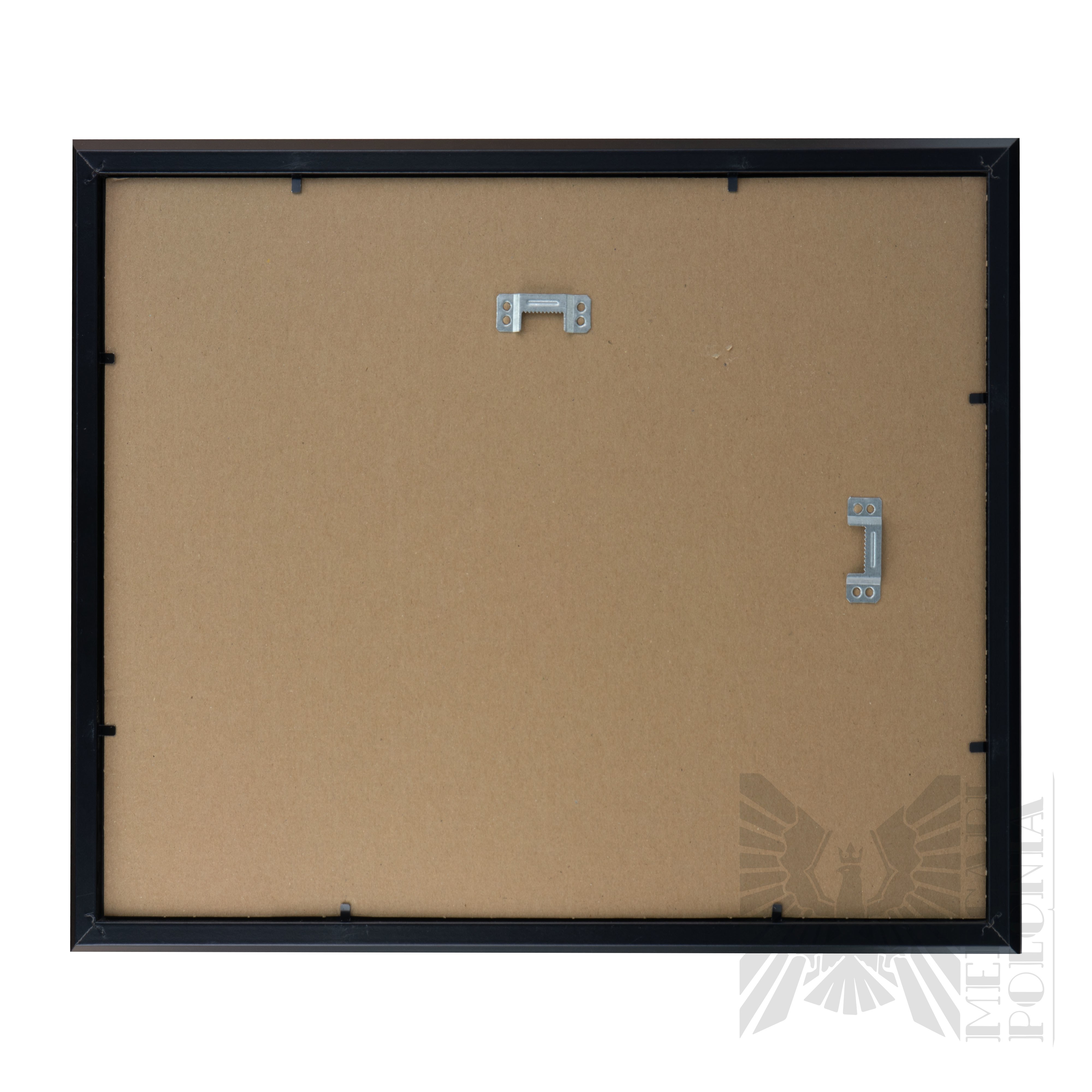 Dokument oprawiony, w eleganckiej czarnej ramie o wymiarach: 43,3 cm x 33,3 cm.