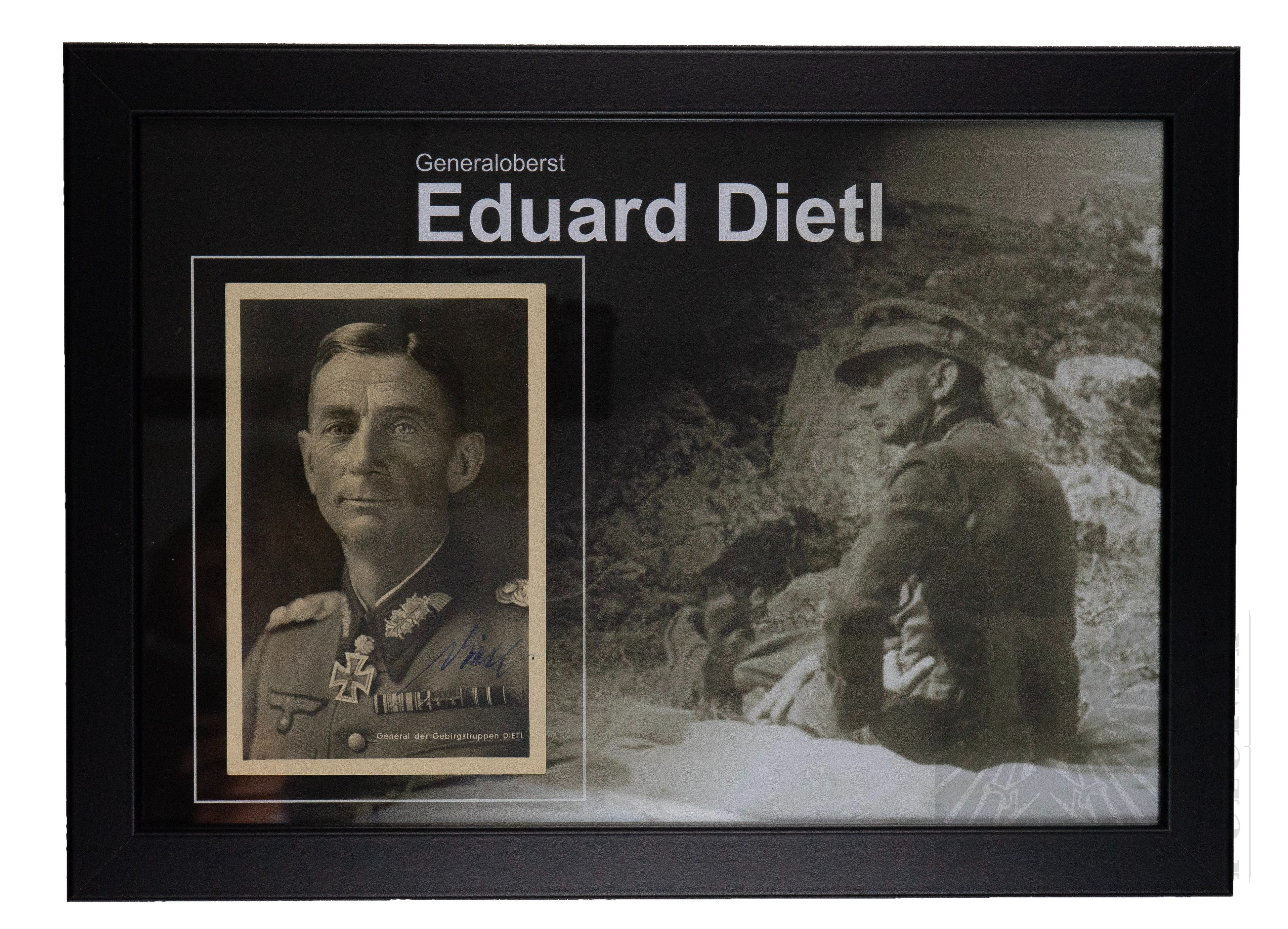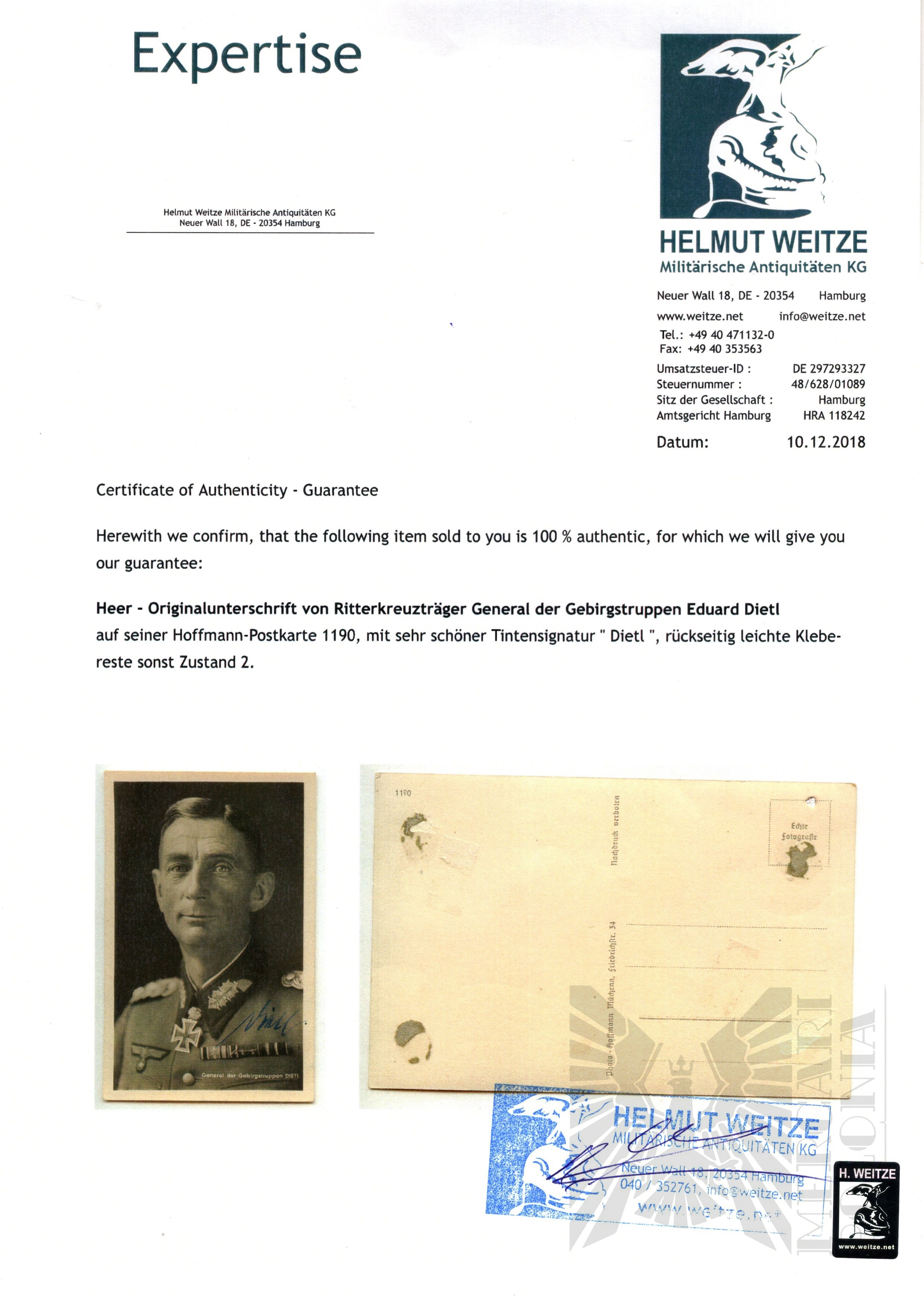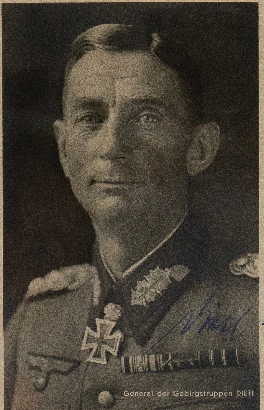 Oryginalny podpis Eduard Dietl - znanego bojówkarza wczesnego członka NSDAP. Podpis umieszczony na oryginalnej pocztówce.
