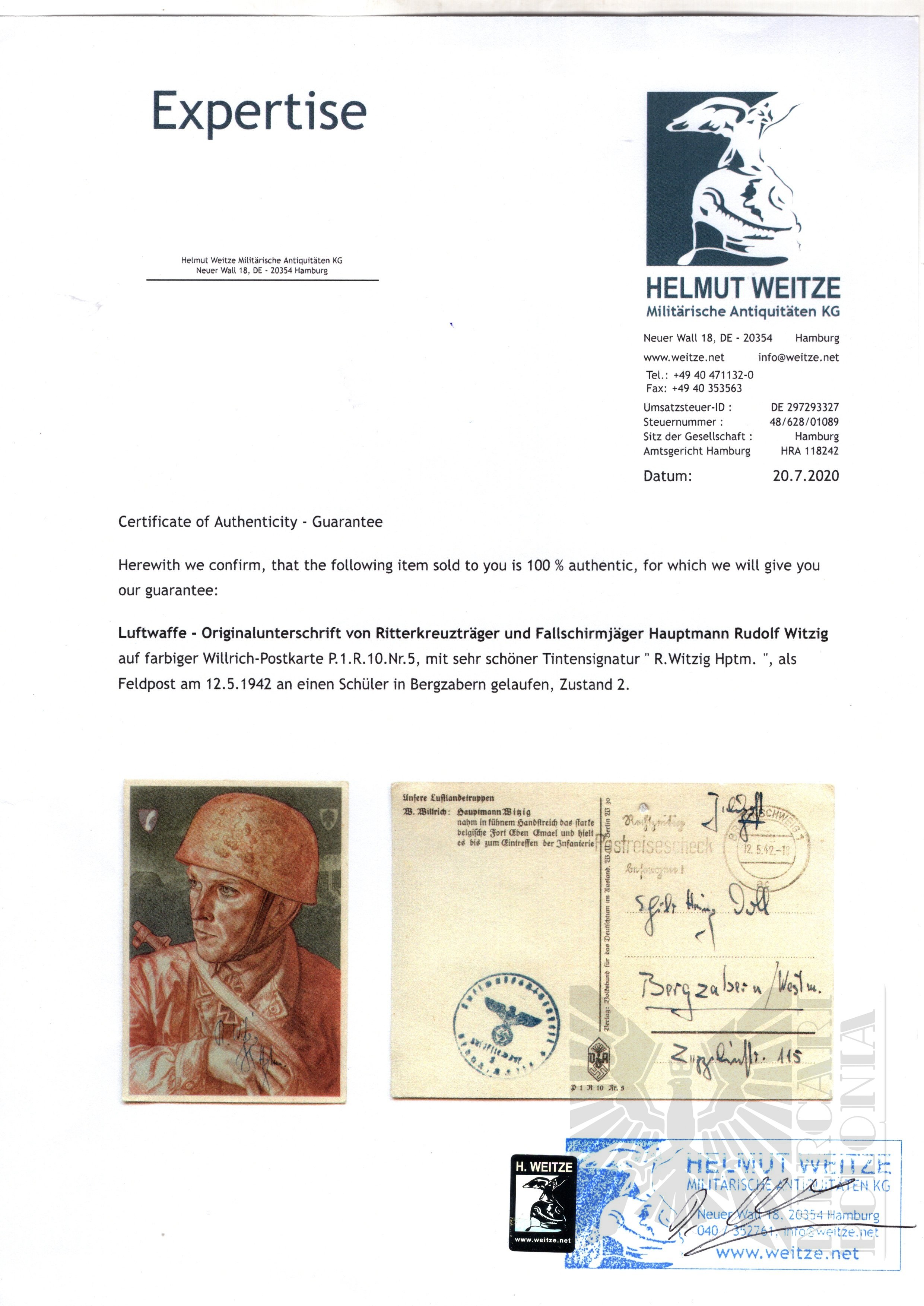Do podpisu dołączony certyfikat autentyczności wystawiony przez uznanego na całym świecie dilera militariów Helmut Weitze.