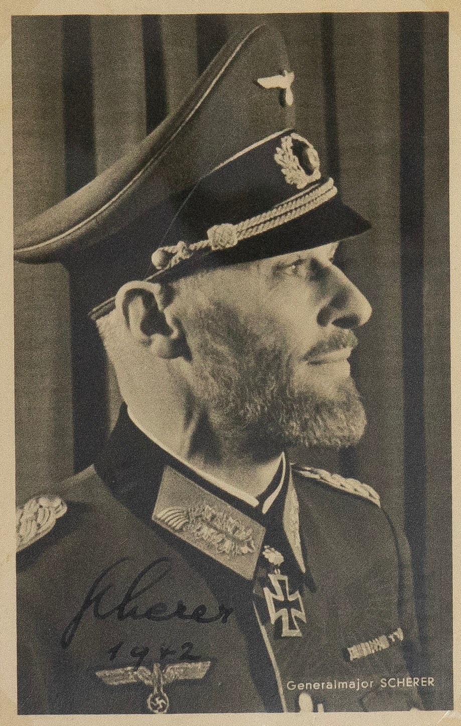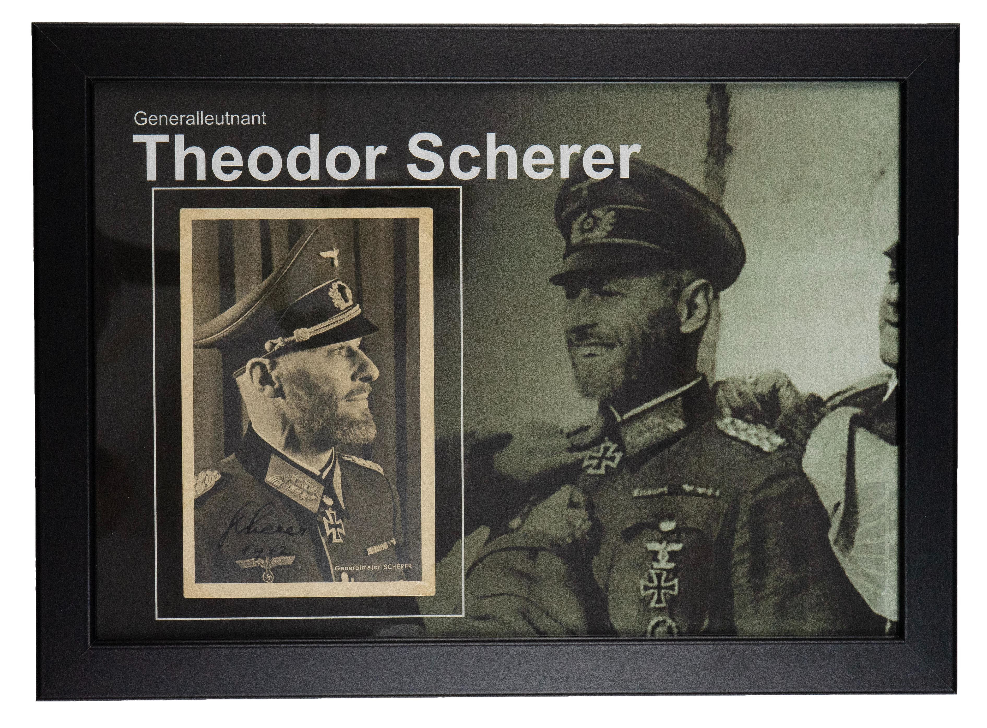 Oryginalny podpis Theodor Scherer, oficer Wehrmachtu w randze generała porucznika, odznaczony Krzyżem Rycerskim Krzyża Żelaznego z Liśćmi Dębu. Podpis umieszczony na oryginalnej pocztówce.