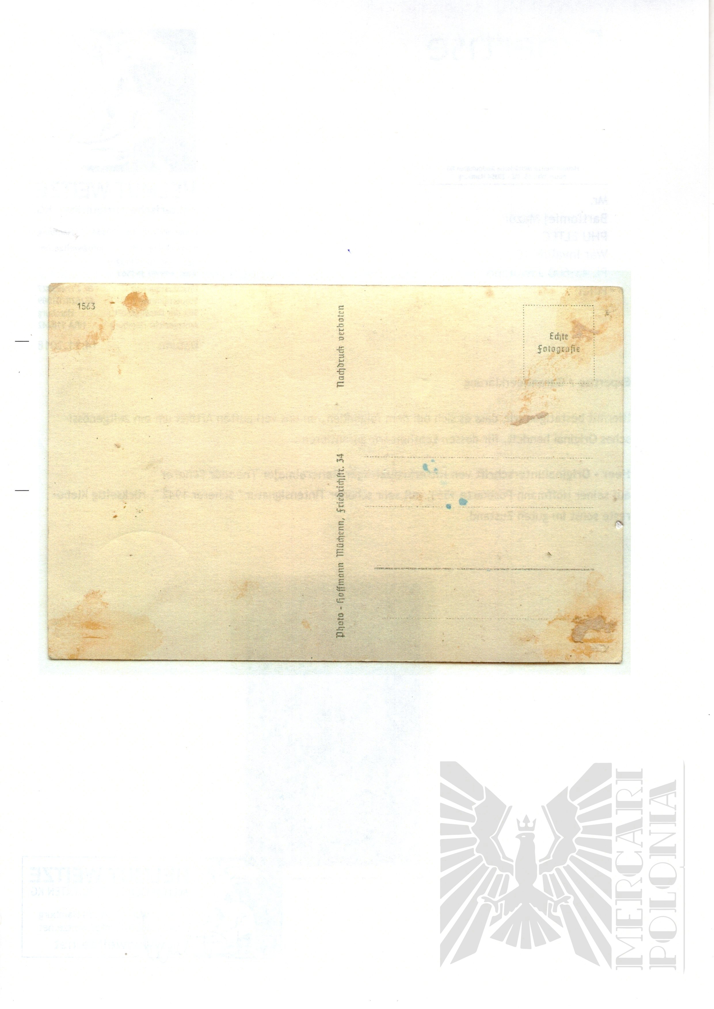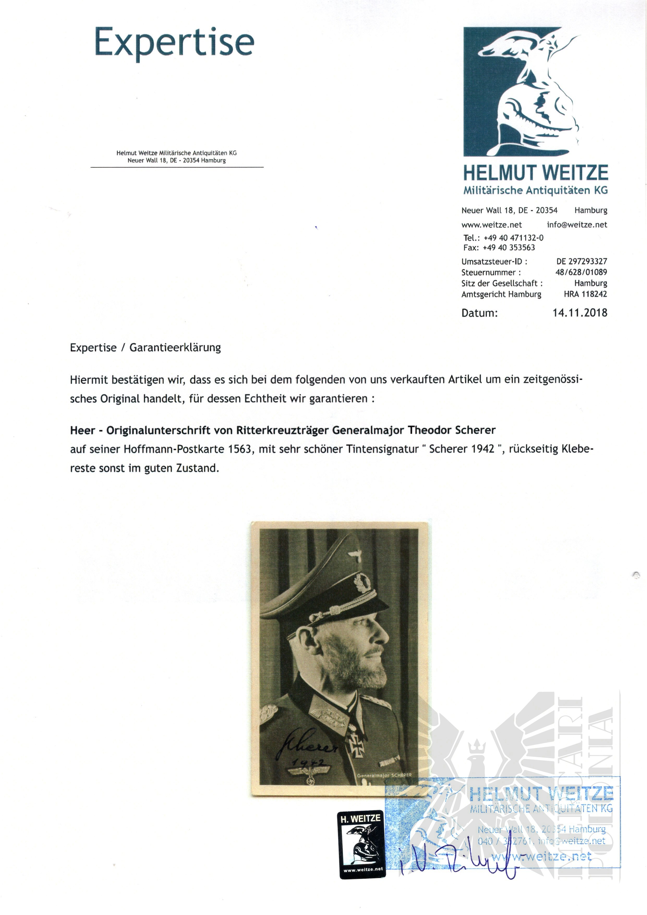 Do podpisu dołączony certyfikat autentyczności wystawiony przez uznanego na całym świecie dilera militariów Helmut Weitze.