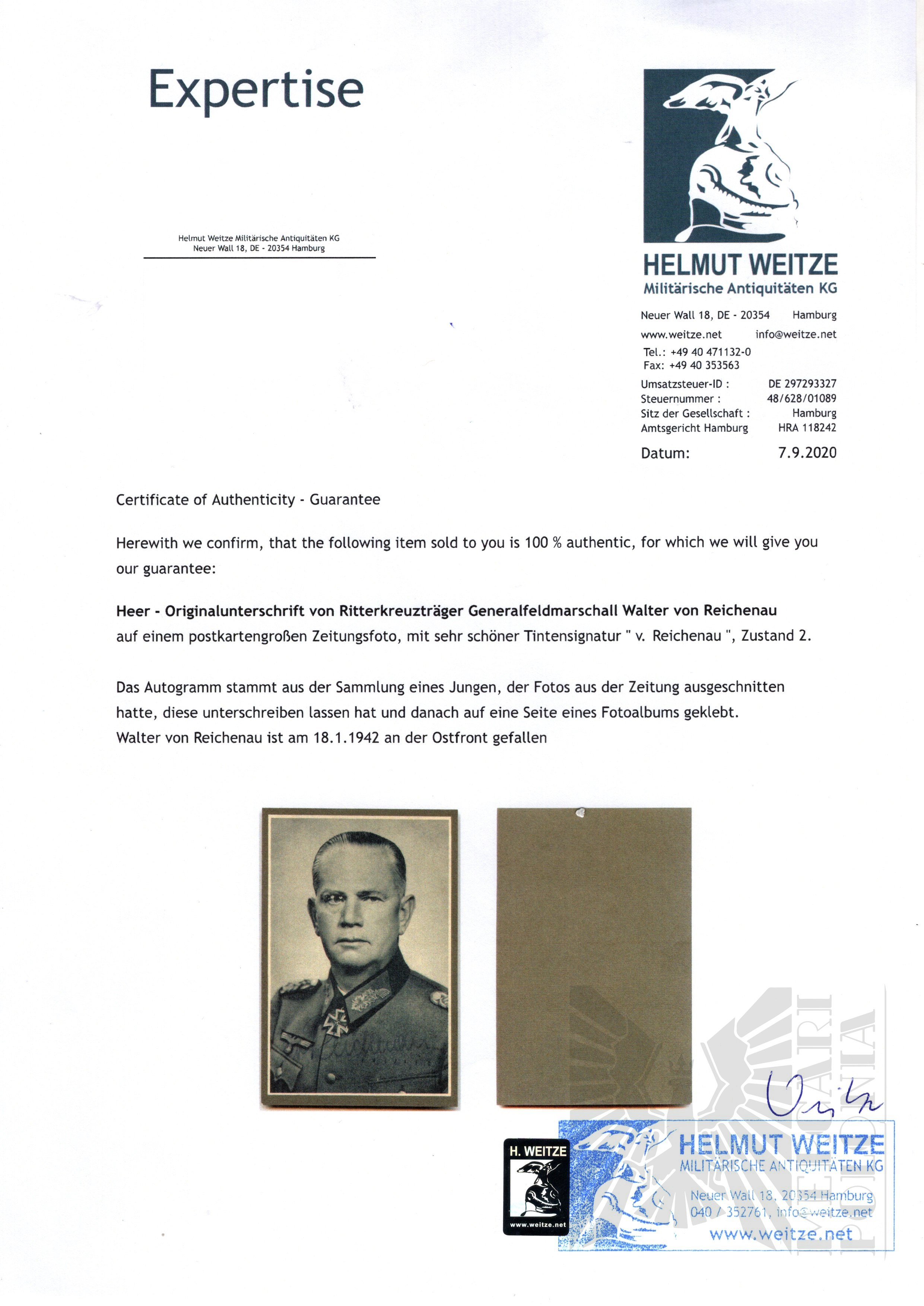 Do podpisu dołączony certyfikat autentyczności wystawiony przez uznanego na całym świecie dilera militariów Helmut Weitze.