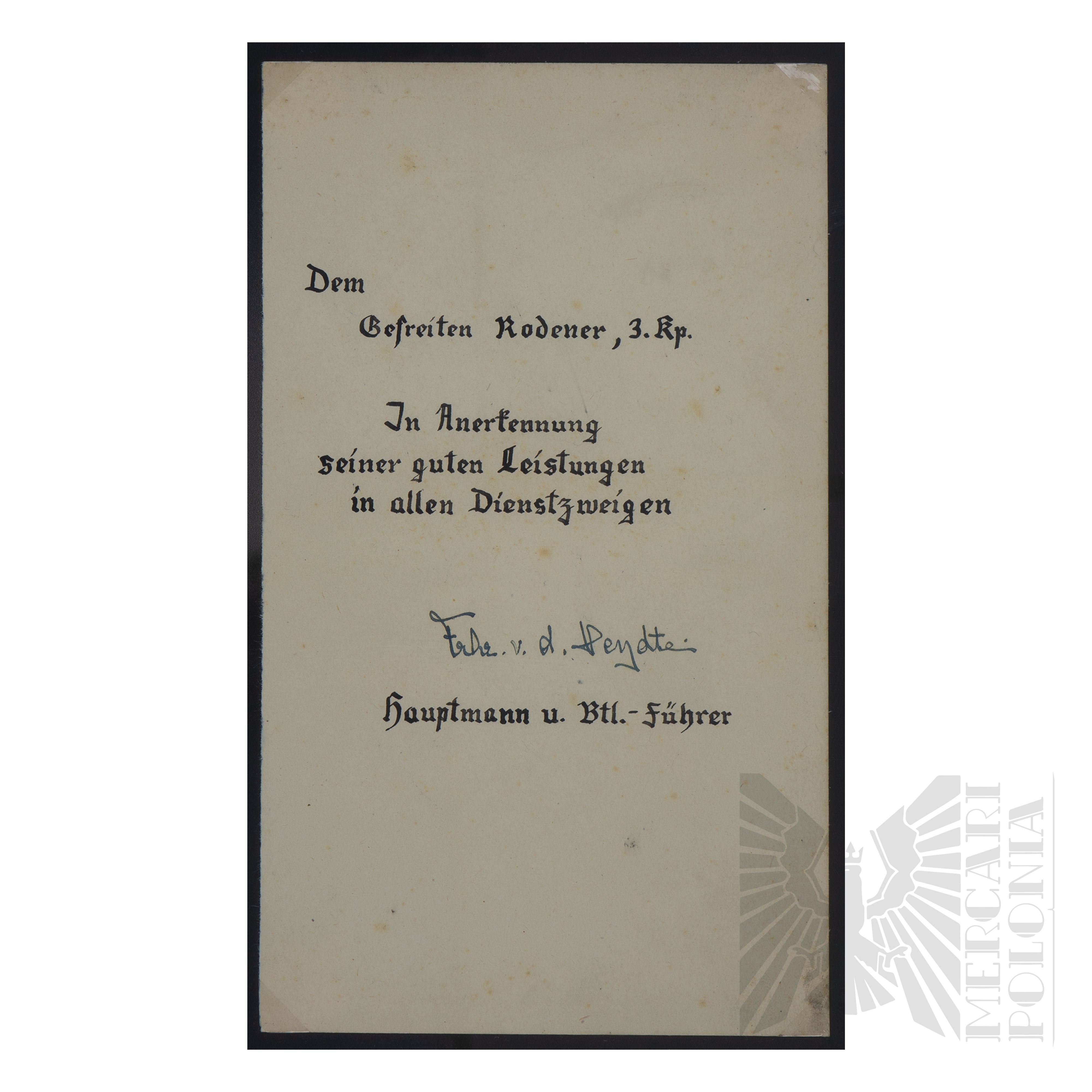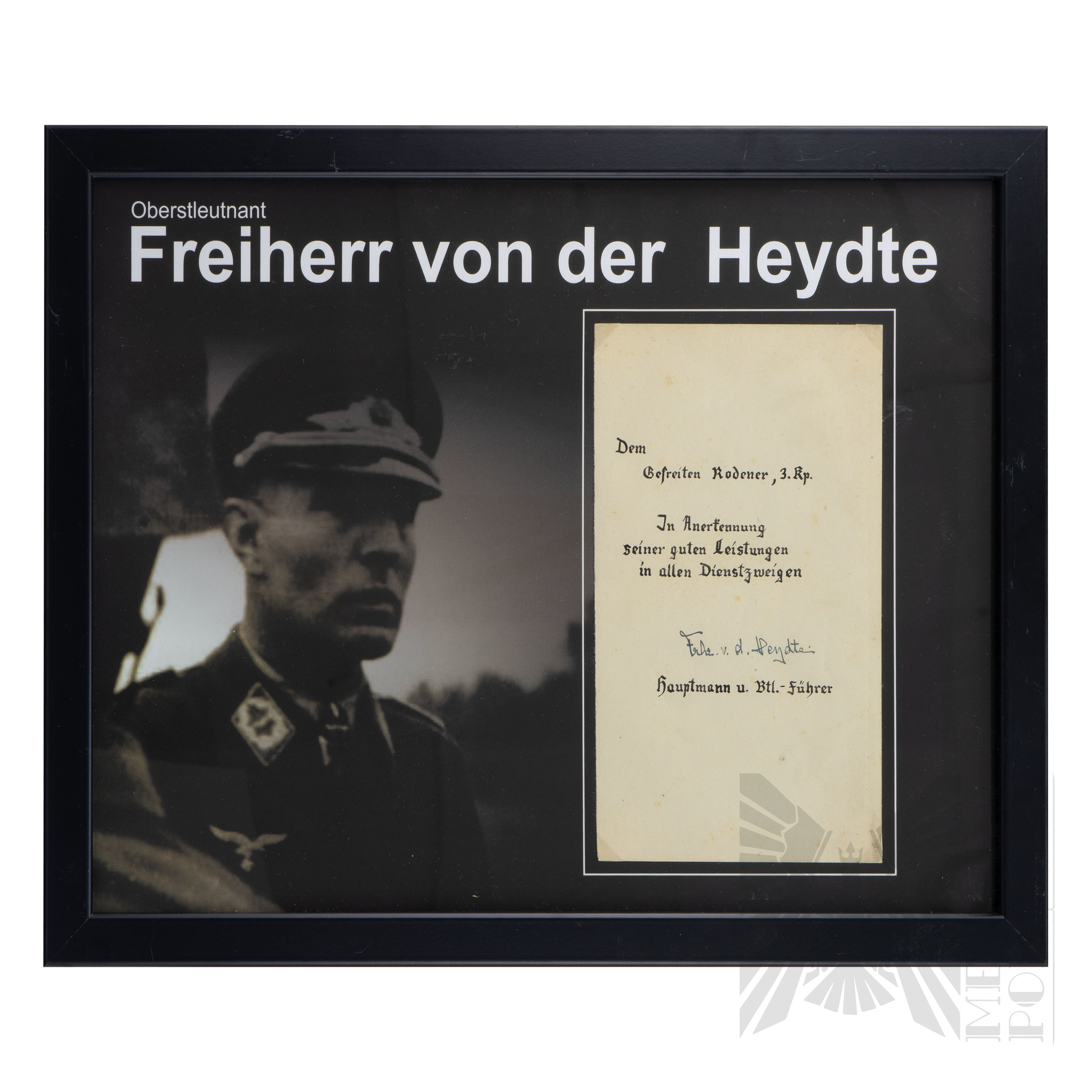 Oryginalny podpis Friedrich August Freiherr von der Heydte, podpis wykonany na pocztówce. dokumencie z okresu wojny z napisem odnoszącym się do uznania zasług w służbie. Podpis umieszczony w ramie wypełnionej kopiami odznak i odznaczeń, które otrzymał Friedrich August Freiherr von der Heydte.