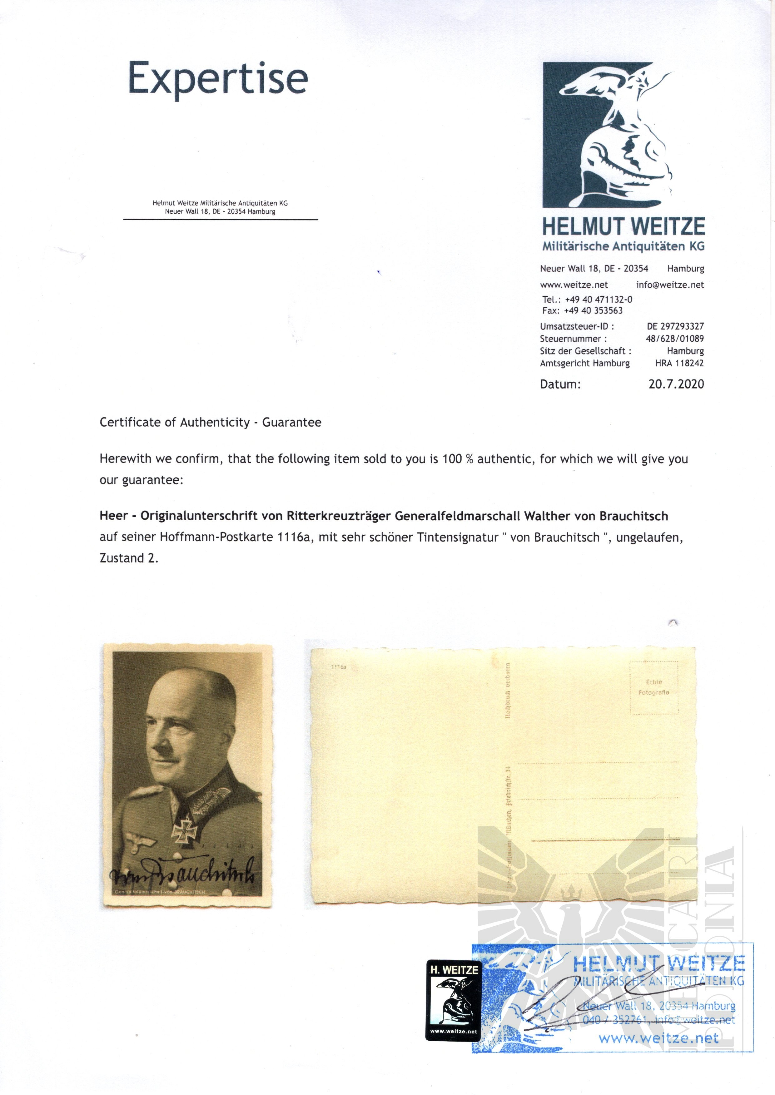 Oryginalny podpis Walther Von Brauchitschl - Naczelny dowódca sił lądowych Niemiec 1938 - 1942 rok, zmarł w trakcie procesu Norymberskiego, uznany za zbrodniarza wojennego.