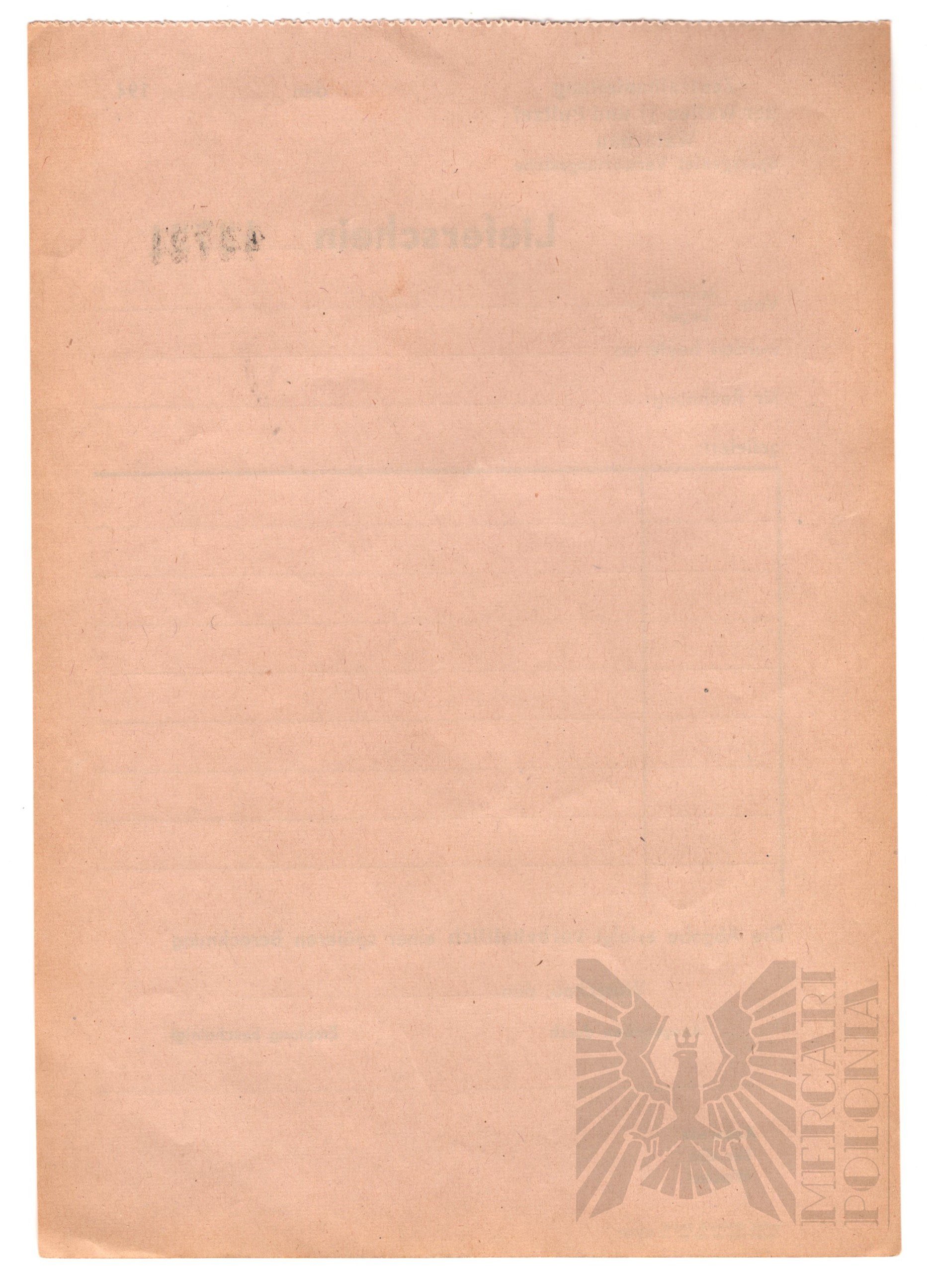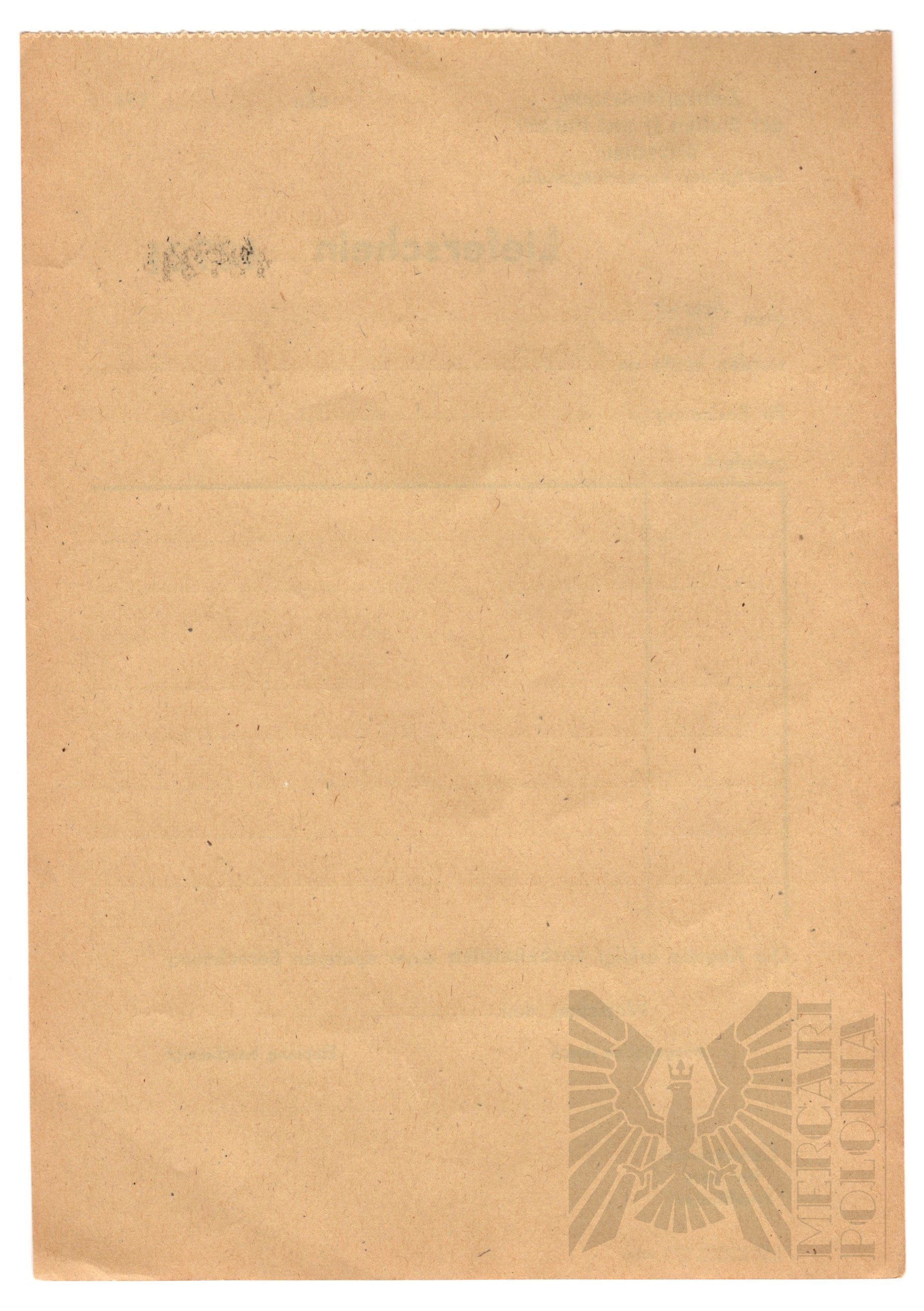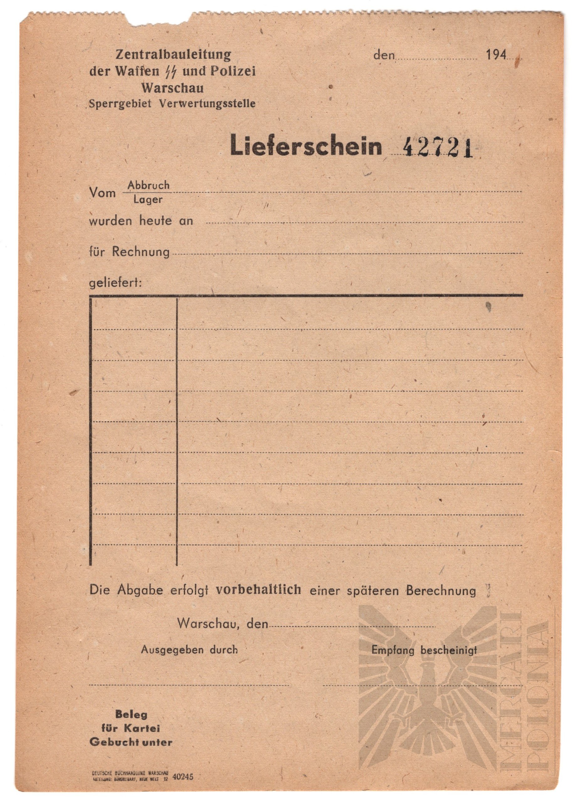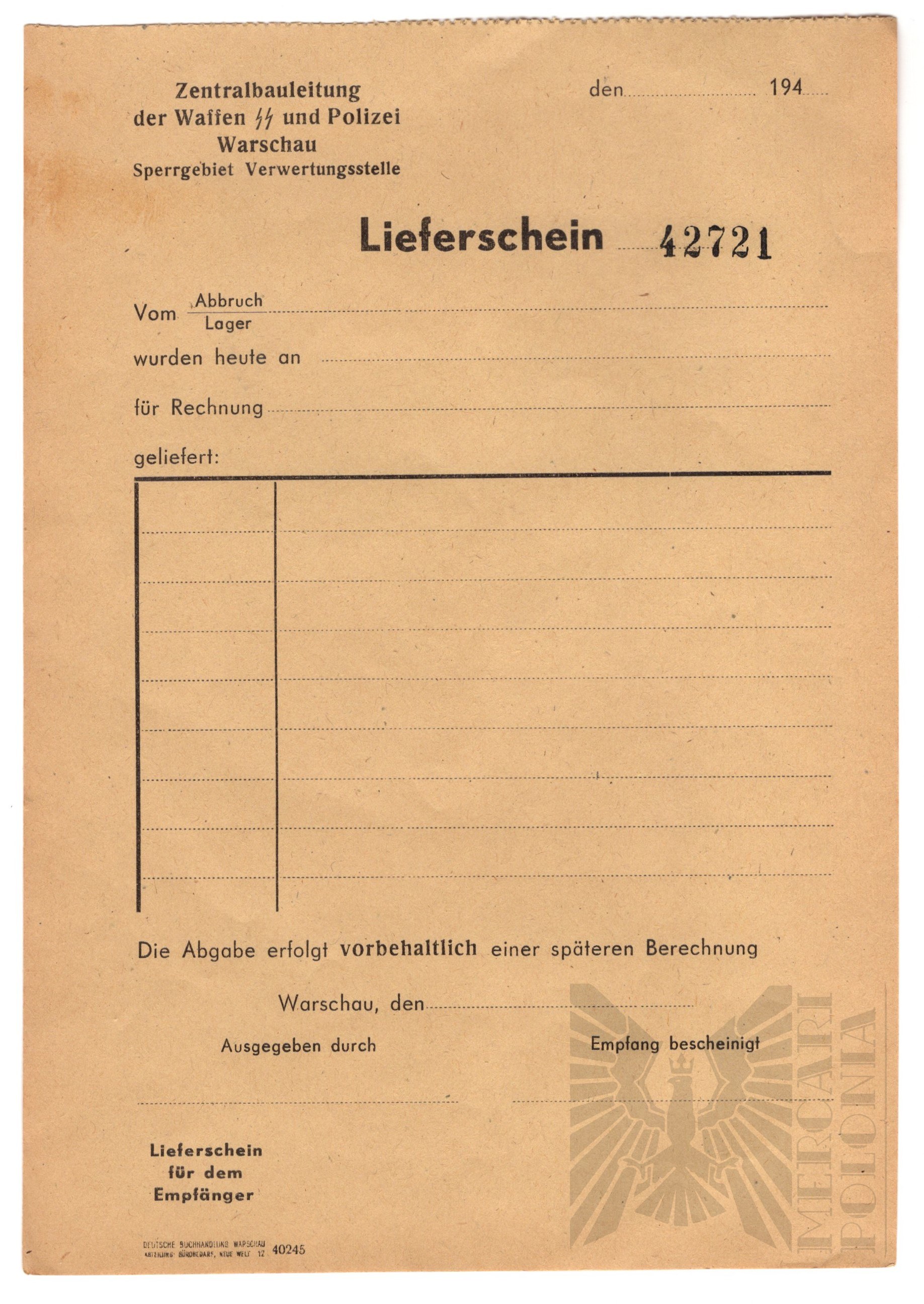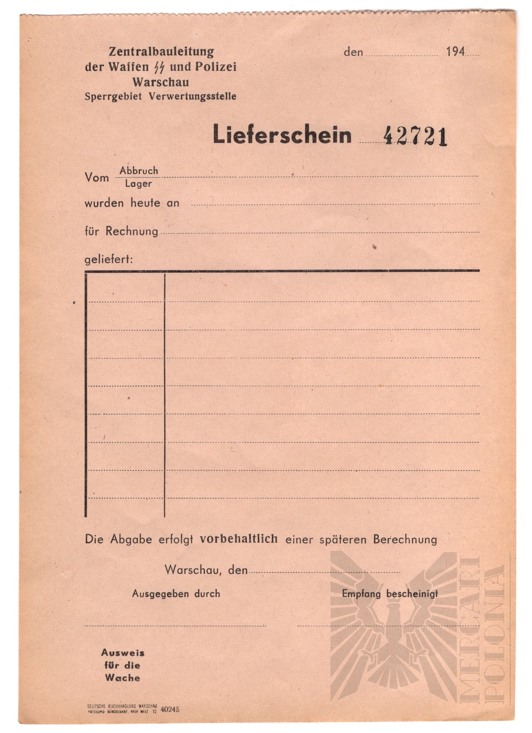 Przy transporcie jakichkolwiek towarów z getta warszawskiego wykorzystano trzy dokumenty, jeden był dowodem, drugi pozostawiono na posterunku przy wchodzeniu i wychodzeniu. Wydany przez Centralny Nadzór Budowlany Waffen SS i Policji w Warszawie – biuro eksploatacji terenów zastrzeżonych (Sperrgebiet – nazwa getta żydowskiego). Dokumenty te nosiły nazwę Lieferschein (zlecenie wysyłki) wszystkich towarów i kosztowności, które zostały skradzione przez nazistowskich Niemców i odebrane polskim Żydom w getcie warszawskim po Powstaniu. Wszystkie 3 w idealnym stanie.