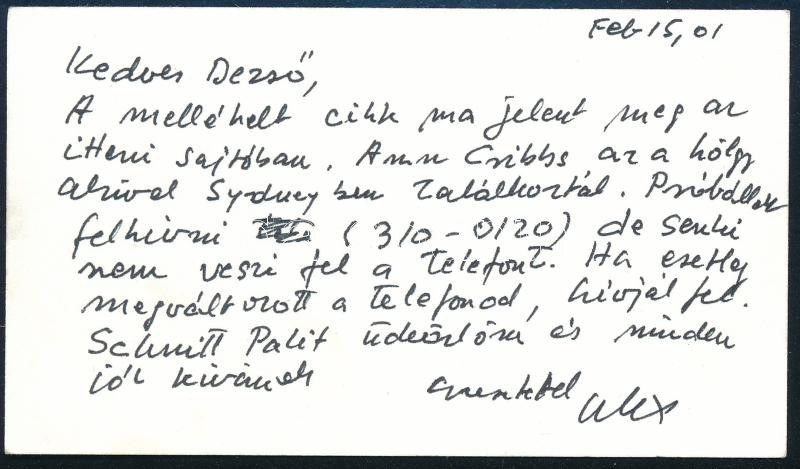 2001 Tarics Sándor (1913-2016) olimpiai bajnok magyar vízilabdázó, építőmérnök sajátkezű sorai, aláírásával, névjegykártyáján.