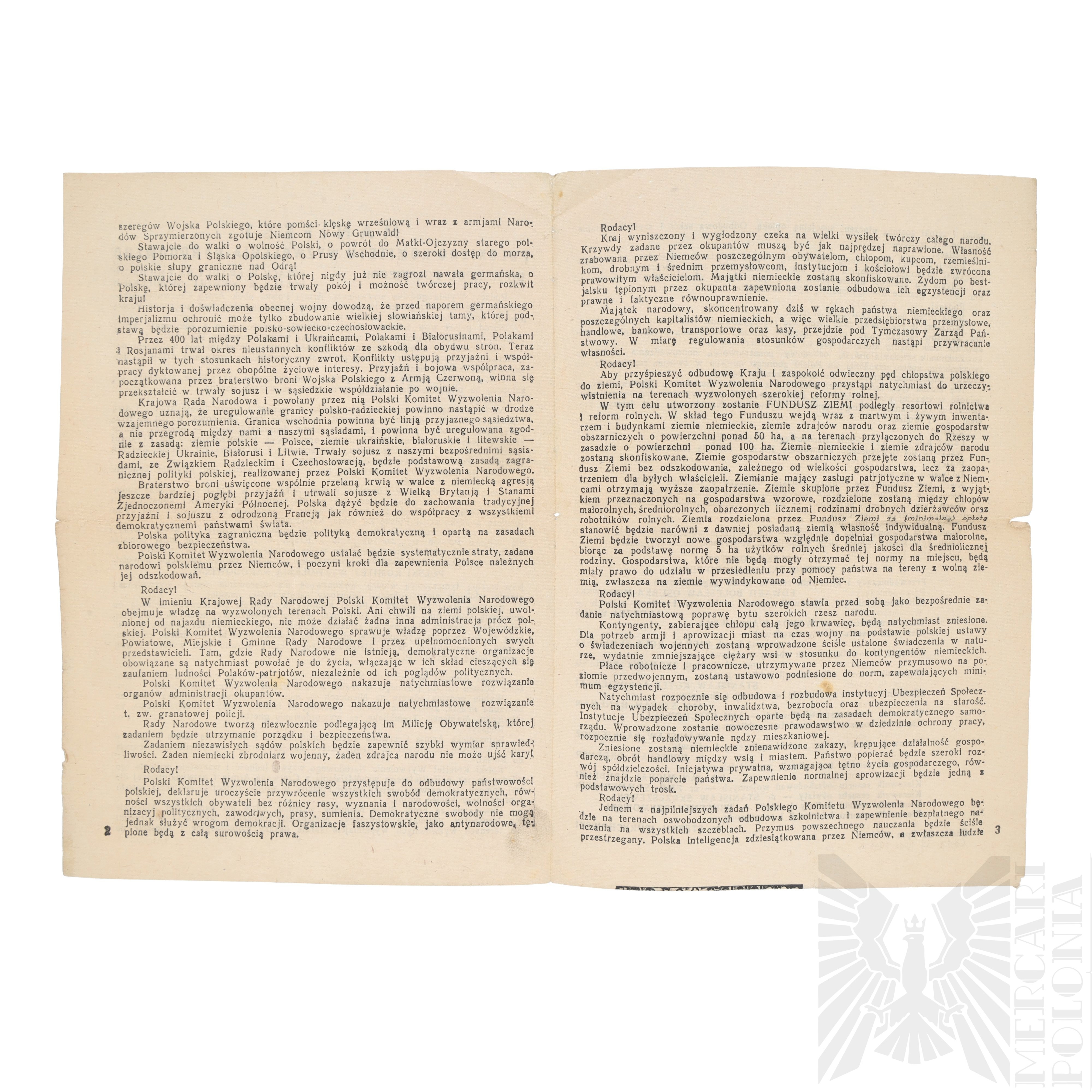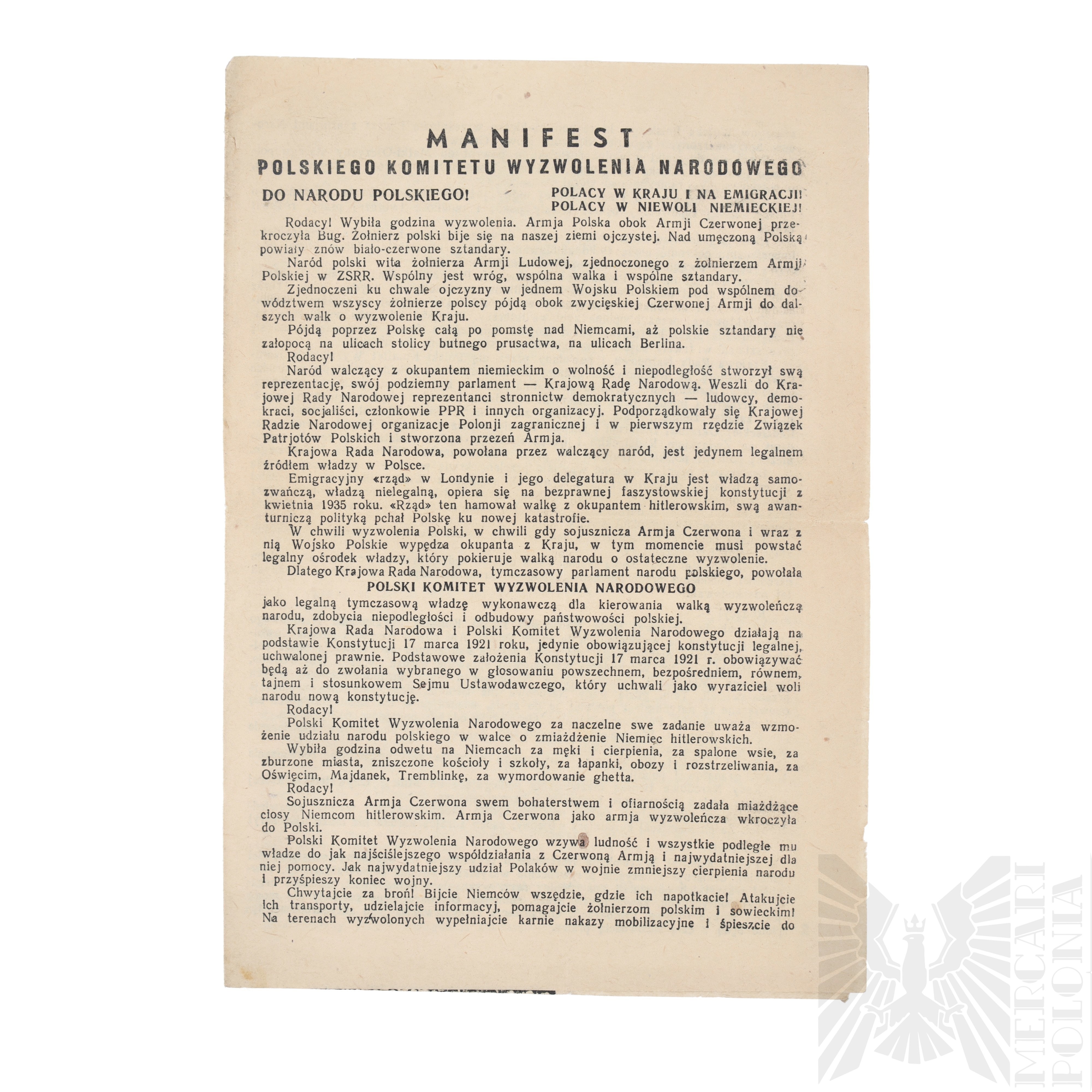 Manifest Polskiego Komitetu Wyzwolenia Narodowego ogłasza rozpoczęcie wyzwalania kraju wraz z wkroczeniem Armii Czerwonej i Wojska Polskiego na ziemie polskie. PKWN, powołany przez Krajową Radę Narodową jako jedyna legalna władza, odrzuca rząd emigracyjny w Londynie jako nielegalny. Wzywa naród do współpracy z Armią Czerwoną, do zbrojnej walki przeciw Niemcom oraz do mobilizacji w szeregi Wojska Polskiego. Manifest zapowiada odbudowę państwa, przywrócenie swobód demokratycznych, surowe karanie zbrodniarzy i zdrajców, rozwiązywanie struktur okupacyjnych oraz tworzenie Milicji Obywatelskiej.