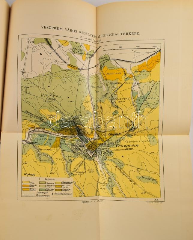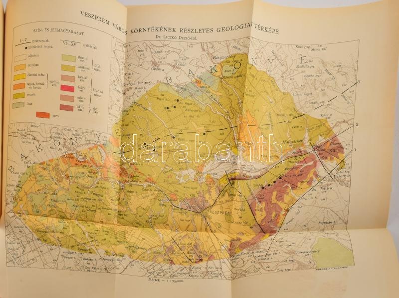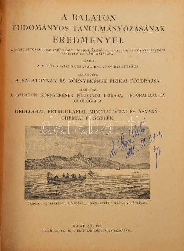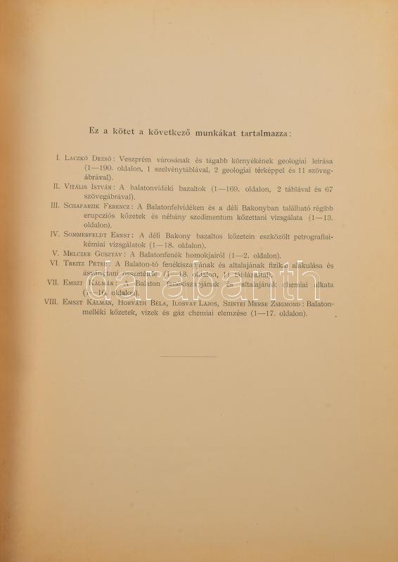 A Balaton tudományos tanulmányozásának eredményei. Geologiai, petrografiai, mineralogiai és ásványchemiai függelék I-VIII. rész. [Egy kötetben.] Kiadja: Magyar Földrajzi Társaság Balaton-Bizottsága. I. rész: Laczkó Dezső: Veszprém városának és tágabb környékének geológiai leírása.; II. rész: Vitális István: A balatonvidéki bazaltok.; III. rész: Schafarzik Ferenc: A Balatonfelvidéken és a déli Bakonyban található régibb erupciós kőzetek és néhány szedimentum kőzettani vizsgálata.; IV. rész: Sommerfeldt, Ernst: A déli Bakony bazaltos kőzetein eszközölt petrográfiai-kémiai vizsgálatok.; V. rész.: Melczer Gusztáv: A Balatonfenék homokjairól.; VI. rész: Treitz Péter: A Balaton-tó fenékiszapjának és altalajának fizikai alakulása és ásványtani összetétele.; VII. rész: Emszt Kálmán: A Balaton fenékiszapjának és altalajának chemiai alkata.; VIII. rész: Emszt Kálmán-Horváth Béla-Ilosvay Lajos-Szinyei Merse Zsigmond: Balatonmelléki kőzetek, vizek és gáz chemiai elemzése. A Balaton tudományos tanulmányozásának eredményei. I. köt. A Balatonnak és környékének fizikai földrajza. 1. rész. A Balaton környékének földrajzi leírása, orografiája és geologiája. Bp., 1911, Kilián Frigyes, (Hornyánszky-ny.), 6+189+5 p.+ 1 (kétlapos) t. + 2 (színes, kihajtható geológiai térképek: Veszprém város környékének részletes geologiai térképe, Veszprém város részletes geologiai térképe ) t.;+4+169+1 p.+2 (a táblák előtt magyarázó lapokkal) t.+2;+2+13+3+;+2+16+2+17-18;+2+2;+2+18 p.+XI (táblázatok) t.;+16+2+17+3 p. Fekete-fehér szövegközti képanyaggal illusztrált. Bekötött papírborítóval. Átkötött modern egészvászon-kötés, névbejegyzéssel, jó állapotban.
