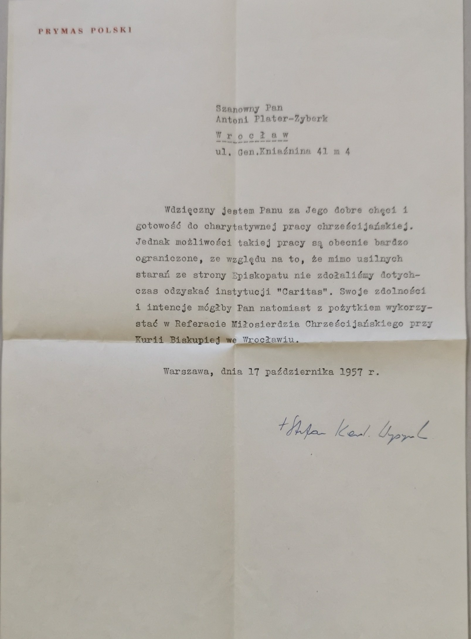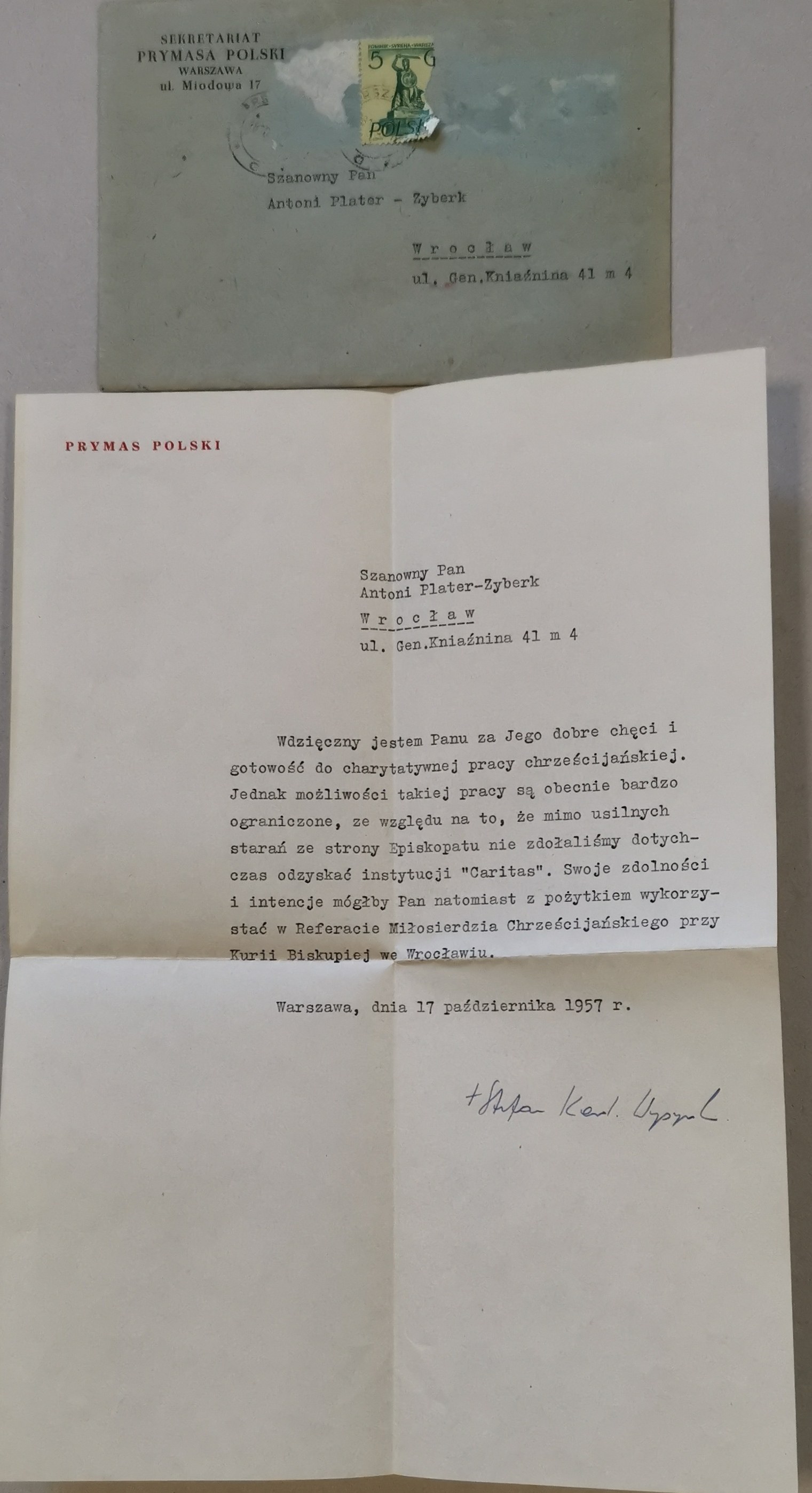 Koperta i list z Sekretariatu Prymasa Polski w Warszawie do Antoniego Plater-Zyberka z 17 października 1957 r. .