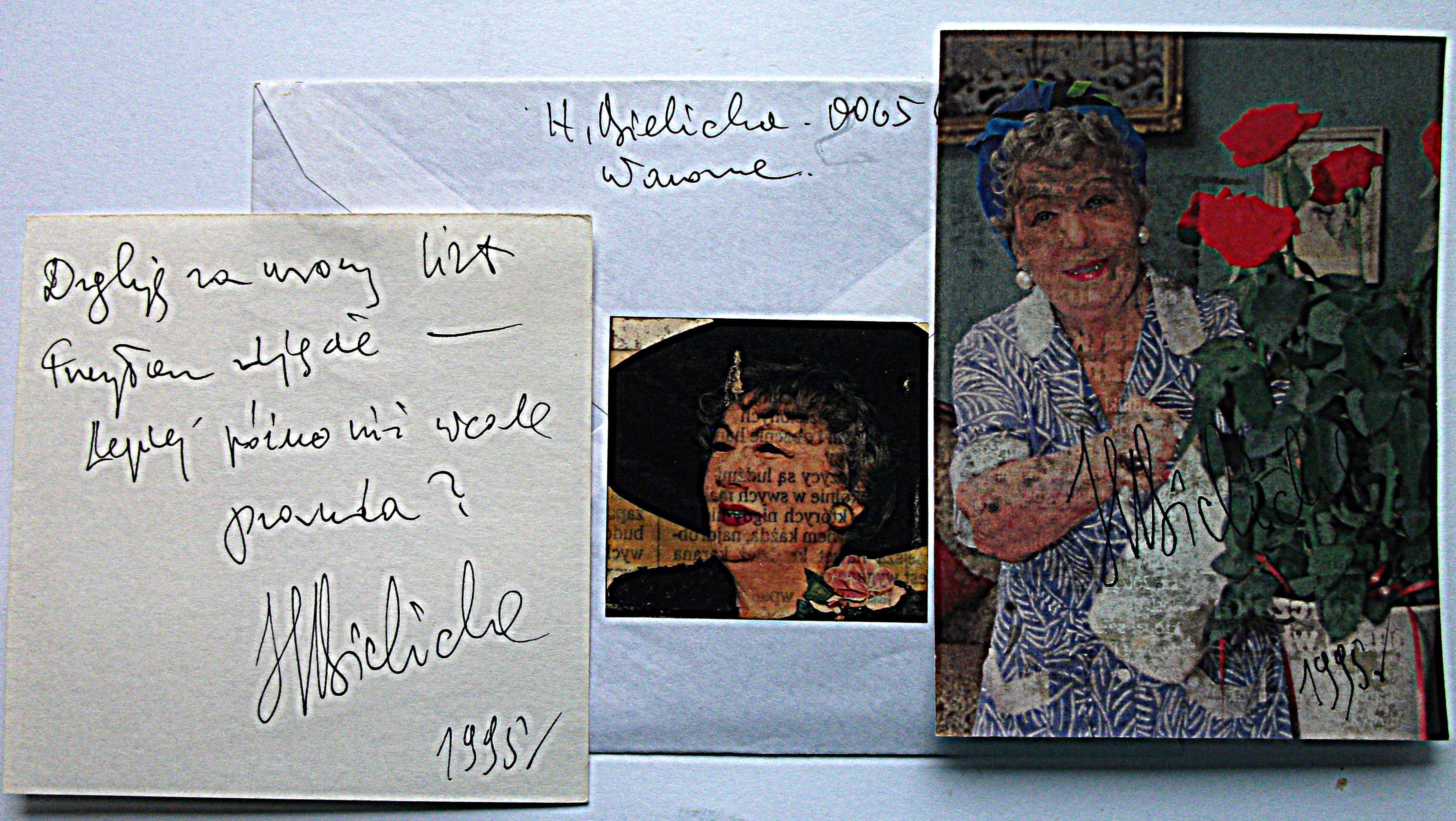 BIELICKA HANKA. Koperta z karteczką z odręcznym tekstem : Dziękuję za uroczy list. Przesyłam zdjęcie - lepiej późno niż wcale prawda? H. Bielicka 1995. Dołączona fotografia z odręcznym podpisem i datą 1995r. Format 8/12 cm.