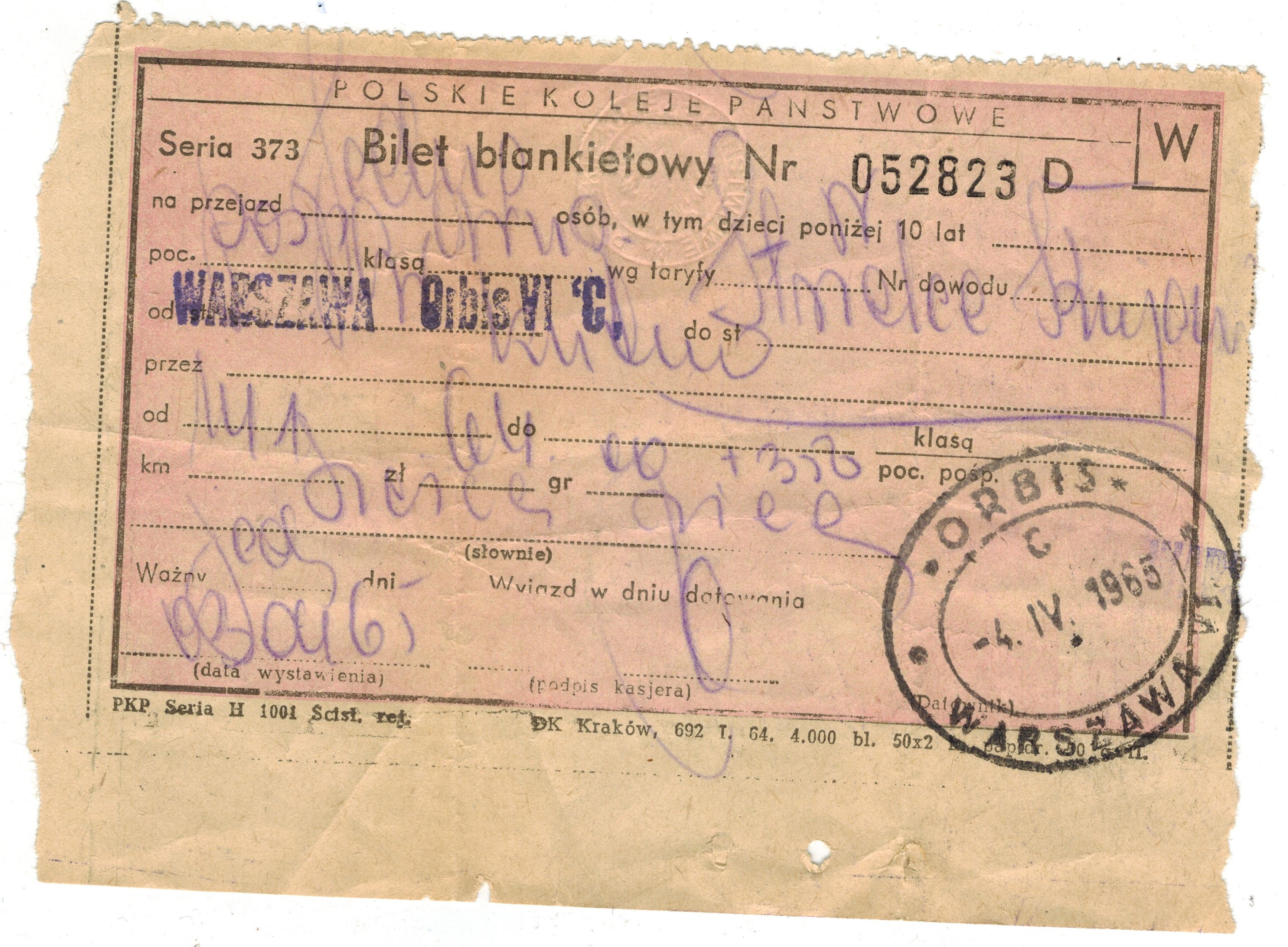 Wypełniono ołówkiem kopiowym w dniu 3.04.65 (przebija na drugą stronę) i pieczątkami (stacja początkowa Warszawa Orbis VI 'C i datownik Warszawa VI Orbis C 4.IV.1965)