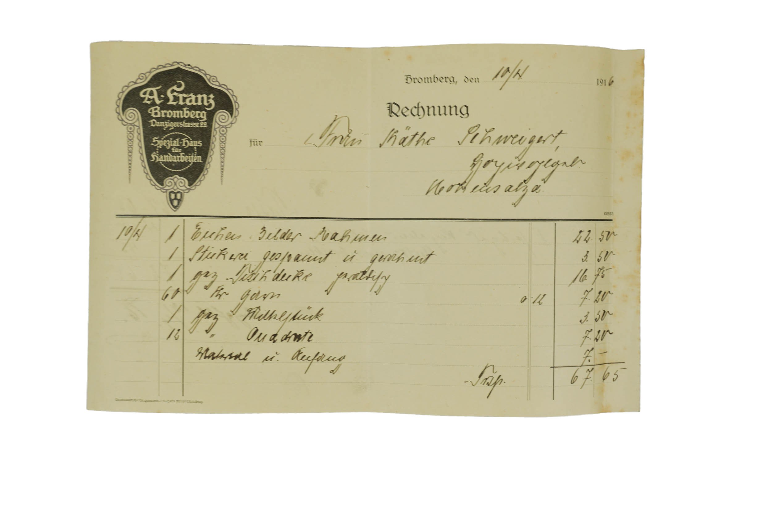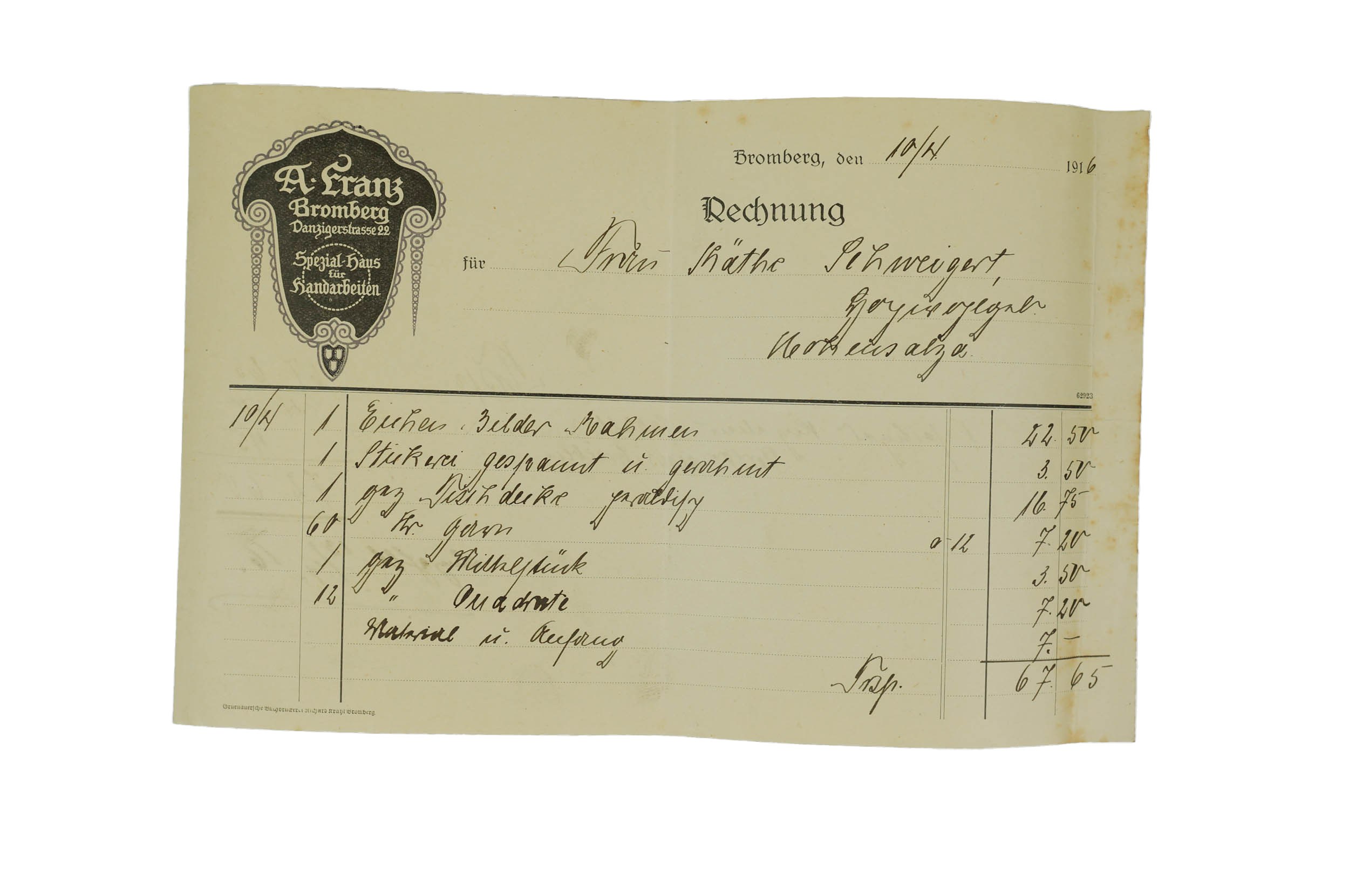 [BYDGOSZCZ] A. Franz Sklep specjalistyczny Rękodzieło RACHUNEK z dnia 10.4.1916r., f. 22x14,5cm, język niemiecki