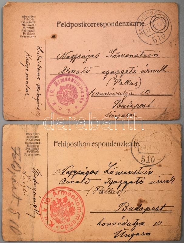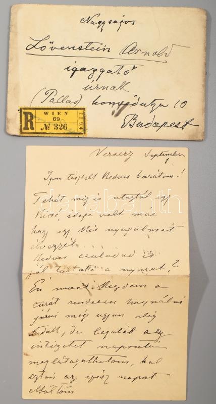 ca 1910-1915 Mednyánszky László (1852-1919) festőművész autográf levelei dr. Löwenstein Arnoldnak a Pallas Irodalmi Rt, igazgatójának, mecénásának. 53 db levél, borítékaikkal. Az egyenként 2-4 oldalas autográf levelekben izgalmas betekintést kapunk a művész életébe. A Bécsből, Budapestről és a frontról írt levelekben alkotómunkájáról, lelki életéről, pályatársairól, anyagi gondjairól is részletesen ír Löwensteinnek, akitől rendszeresen pénzt is kér, életvitelének folytatására. Egyedülálló művészettörténeti anyag, érdemes átnézni!