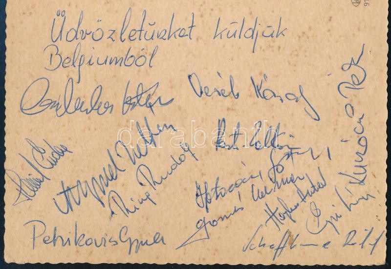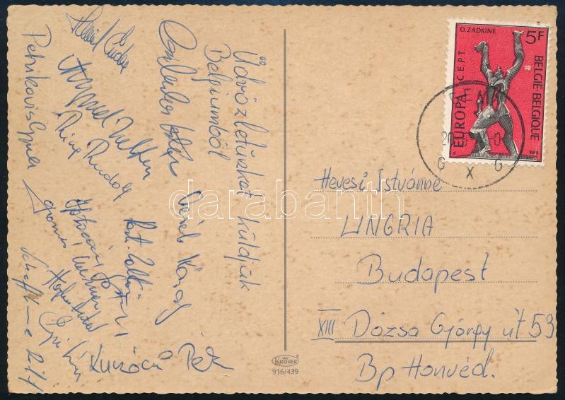 ca 1980 Magyar kajak kenusok aláírása Belgiumból hazaküldött képeslapon Petrikovics, Ring Rudolf, Veréb, Galambos, Kunóczi, stb, / Autograph signatures of Hungarian kayak-kenu team members