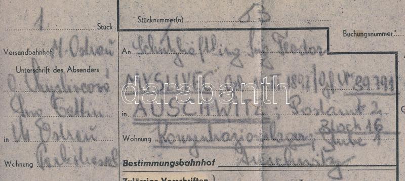 cca 1944 Expressz vasúti fuvarlevél az Auschwitzi koncentrációs táborba egy élelmiszercsomagról...