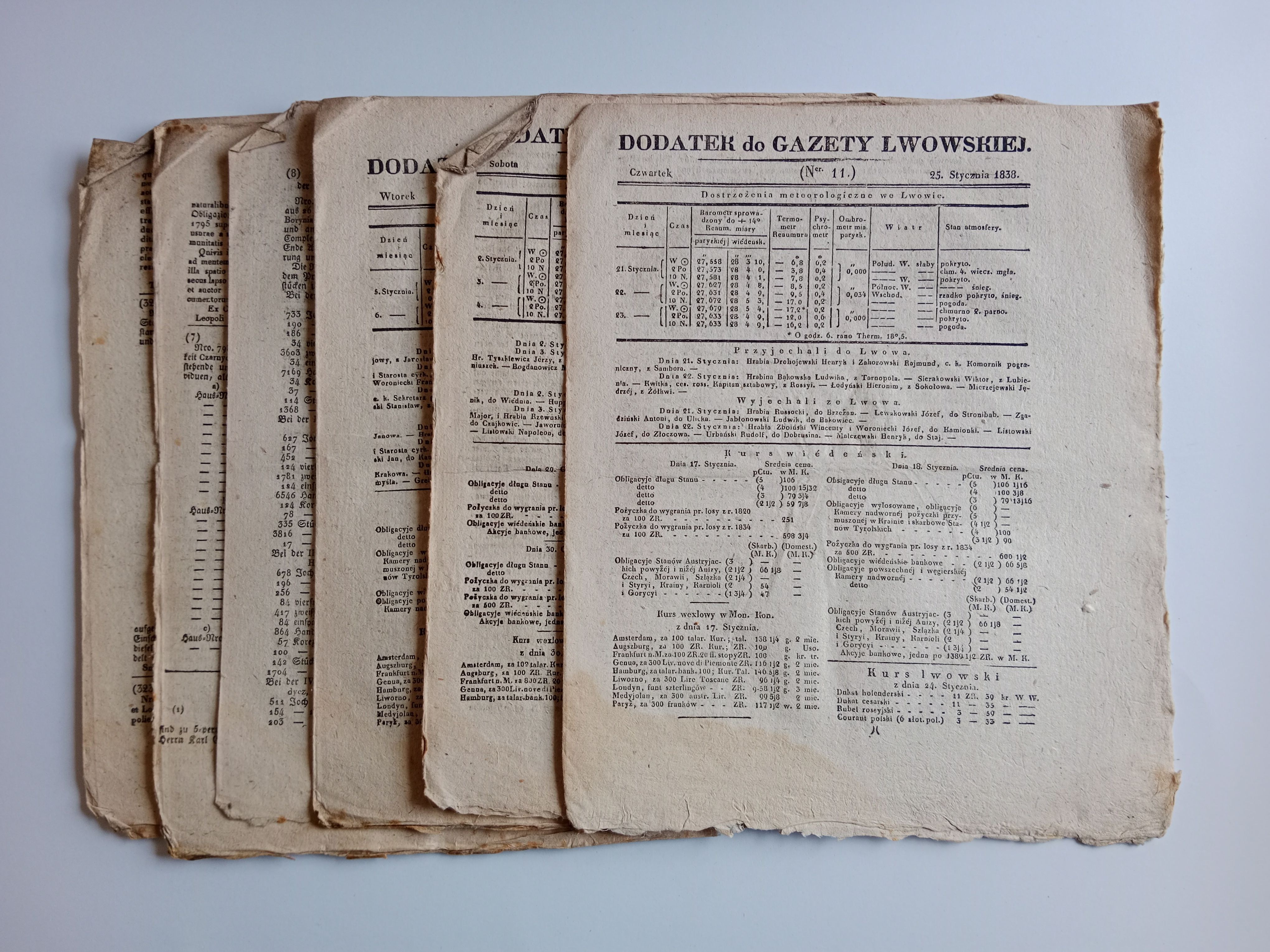 Lwów, Informacje , pogoda, spis osób zmarłych, kursy walut, dzienniki urzędowe, stan dobry, dodatek z dnia 06 stycznia, 9 stycznia, 26 stycznia 1838, łacznie 21 stron, stan dobry