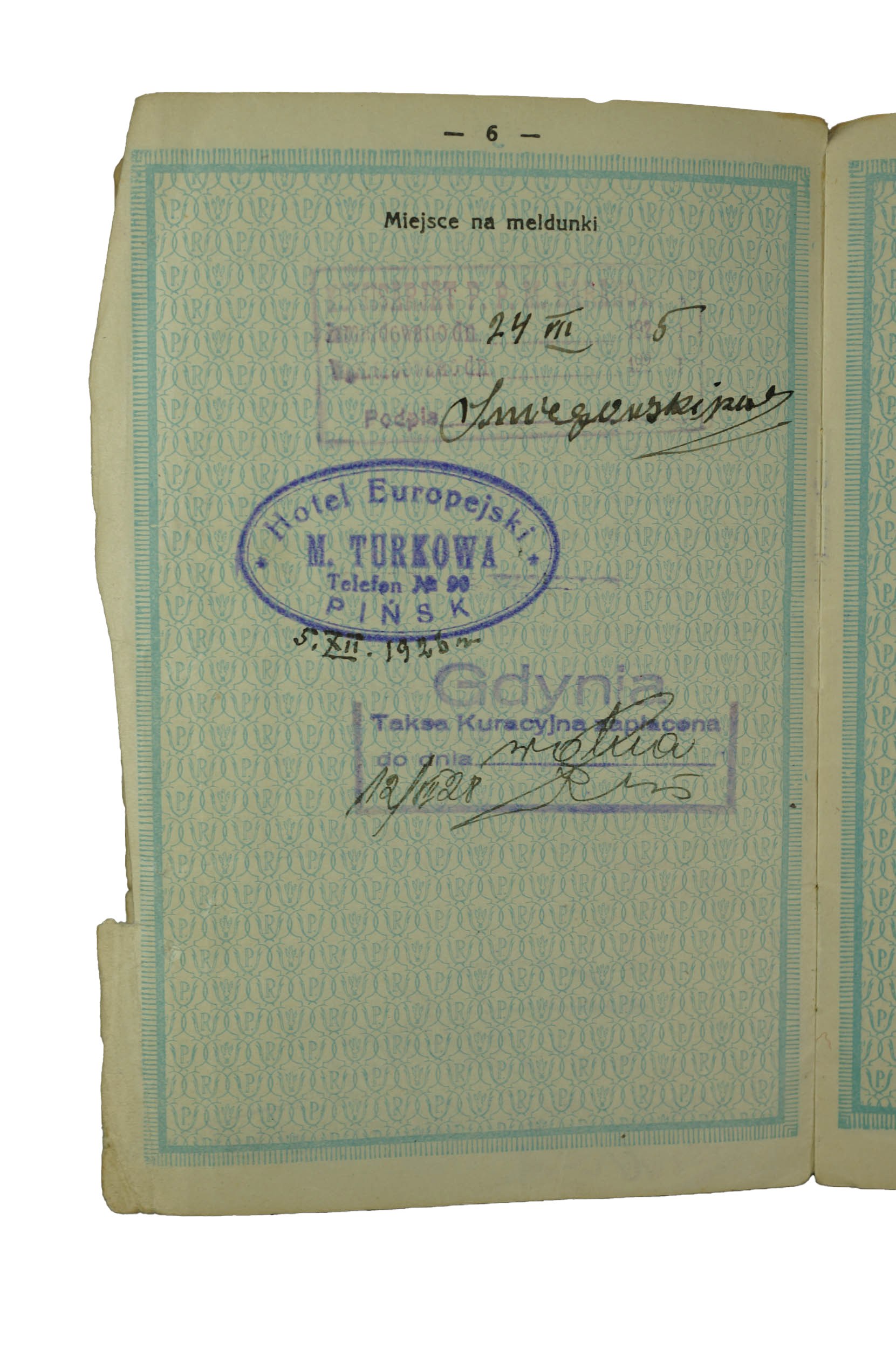 stemple meldunkowe: Hotel Europejski M. Turkowa, Pińsk oraz Gdynia Taksa kuracyjna