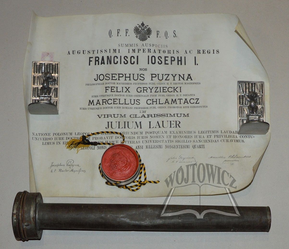 "Summis Auspicis Augustissimi Imperatoris ac Regis Francisci Josephi I nos Josephus Puzyna... Felix Gryziecki... Marcellus Chlamtacz... in virum clarissimum Julium Lauer, natione Polonum Leopoli in Galicia ... Doctoris Iuris ... Leopolis 1904." Dokument na pergaminie (41 x 56 cm). Dat. Lwów 1904. Odręczne podpisy: prof. Józefa Puzyny, dr Felixa Gryzieckiego i prof. Marcellego Chlamtacza. Do pergaminu podwieszona na sznurkach pieczęć lakowa w metalowej kapsule (średnica pieczęci 8 cm). Całość w metalowej tubie.