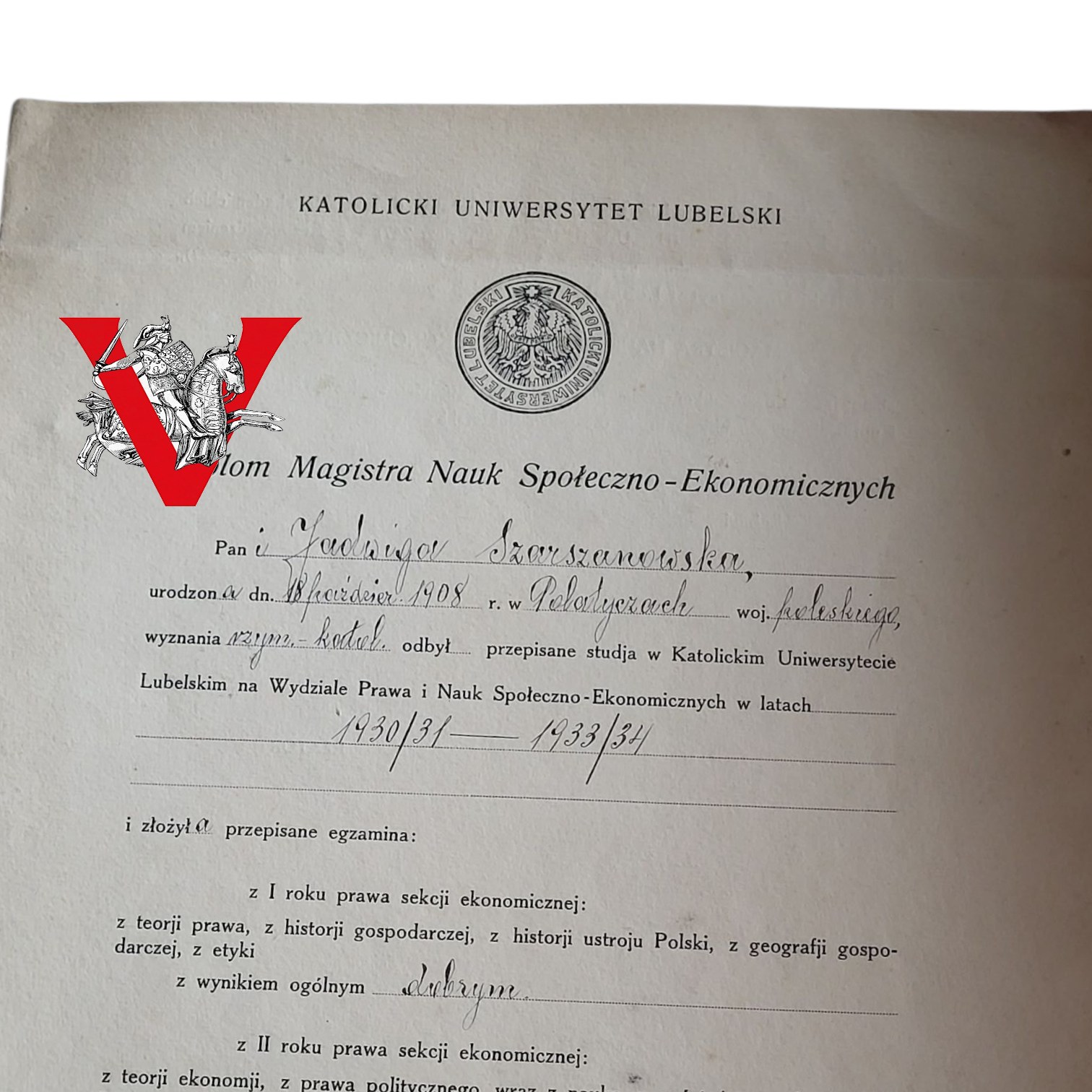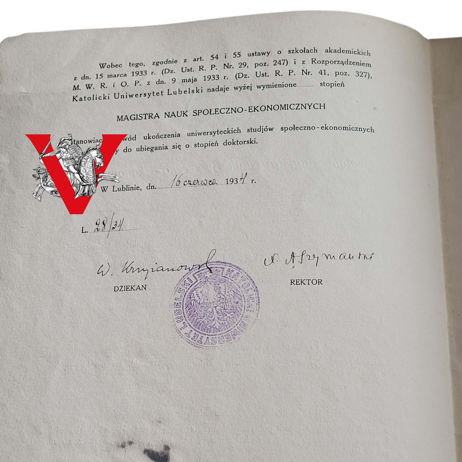 Dokument wydany dnia 16 czerwca 1937 roku w Lublinie potwierdza uzyskanie tytułu Magistra Nauk Społeczno-Ekonomicznych po ukończeniu studiów na Wydziale Prawa i Nauk Społeczno-Ekonomicznych w latach 1930/31 – 1933/34.