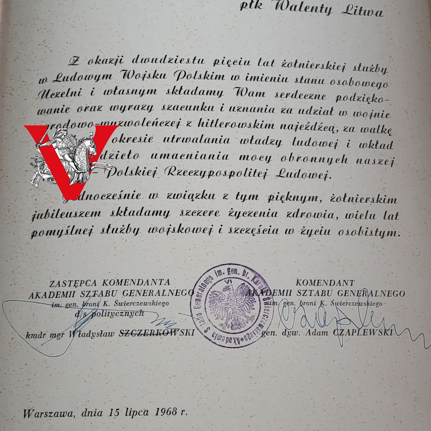 Pamiątkowy dyplom wręczony pułkownikowi Walentemu Litwie z okazji 25-lecia służby w Ludowym Wojsku Polskim. Dokument wydany przez Akademię Sztabu Generalnego im. gen. broni Karola Świerczewskiego w Warszawie, 15 lipca 1968 r.