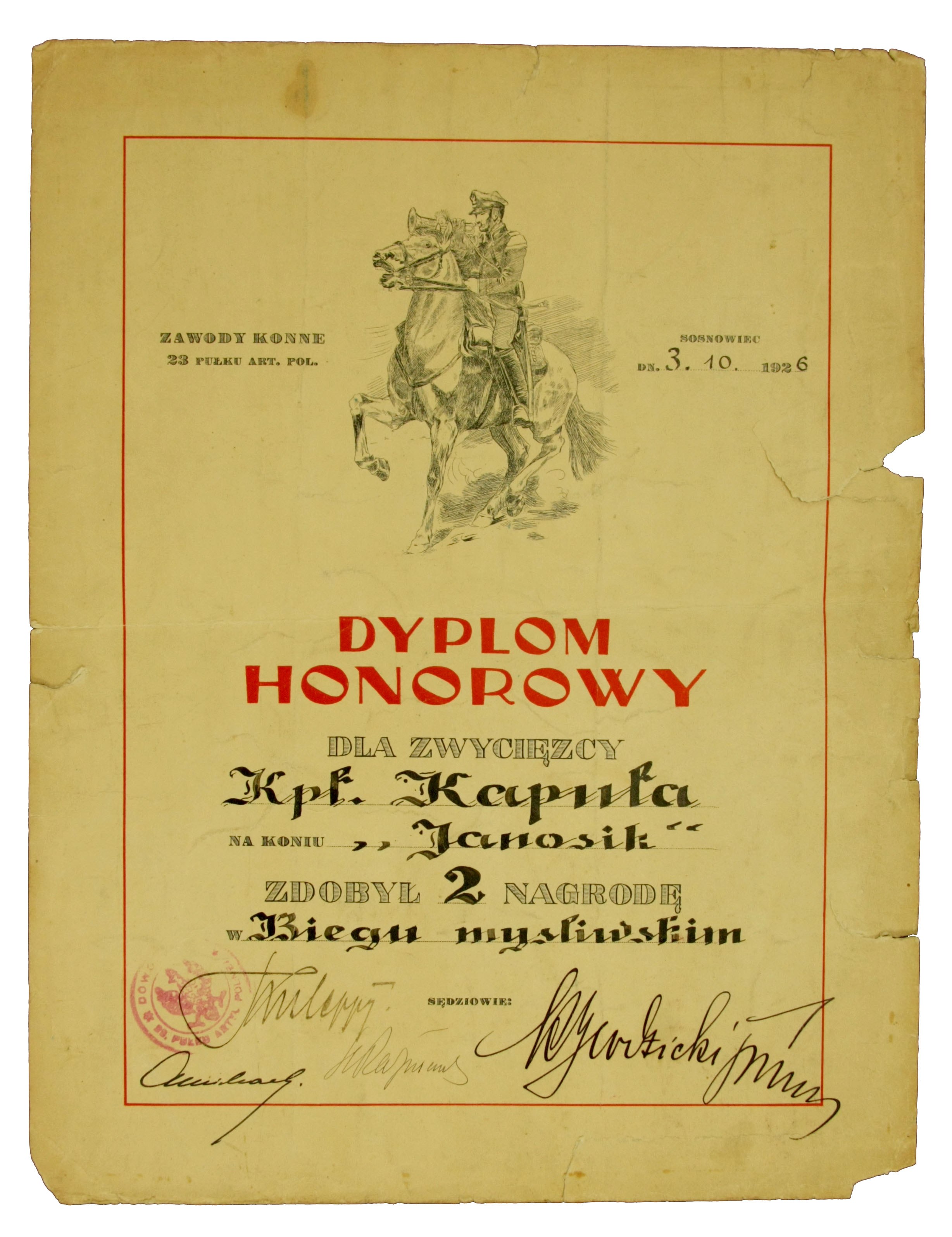 Dyplom za Bieg Myśliwski w 23 Pułku Artylerii Polowej, Sosnowiec 1926 r. Wym. 28 x 36 cm.