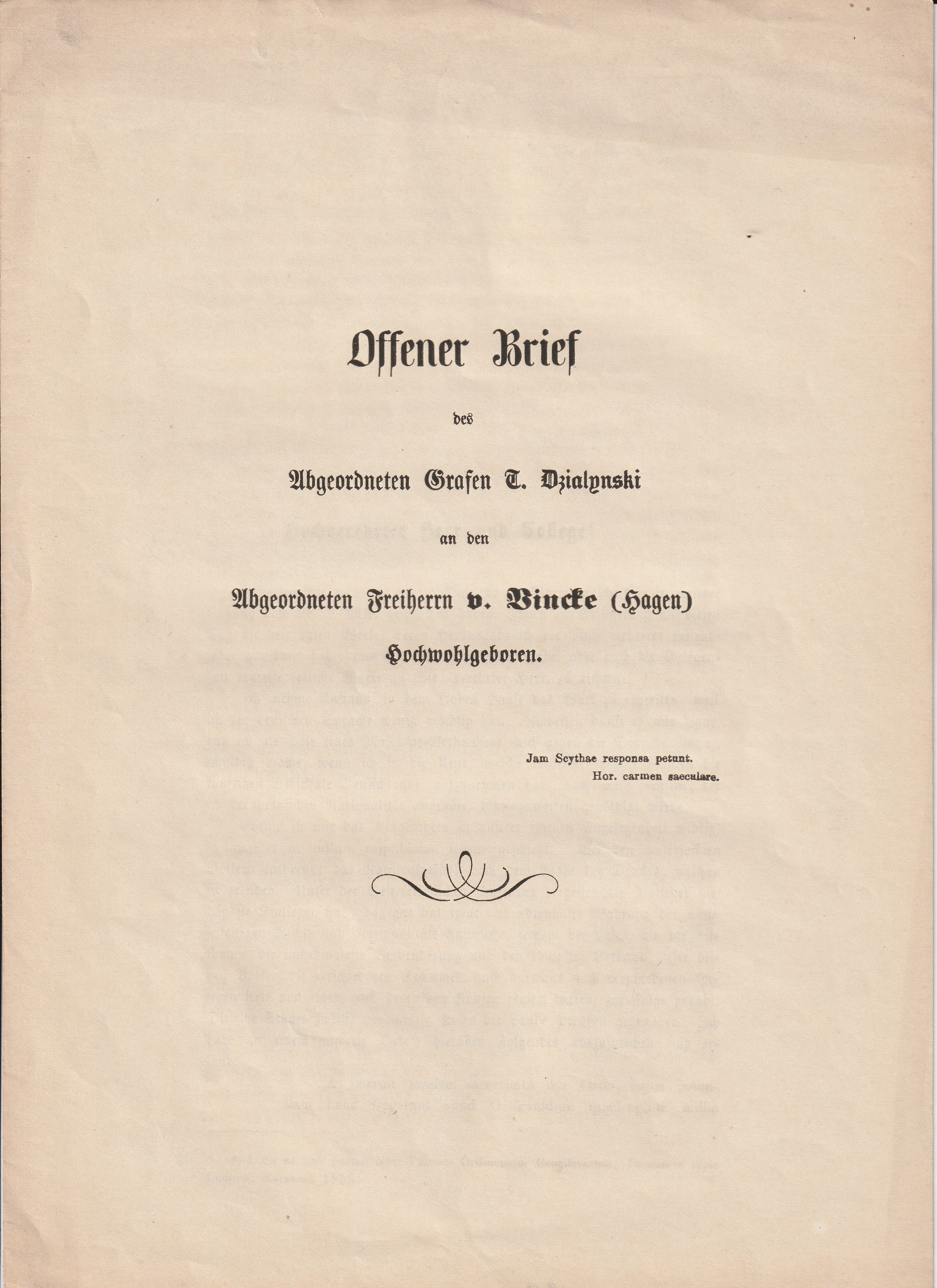 DZIAŁYŃSKI Tytus. List otwarty Tytusa Działyńskiego, członka pruskiej Izby Panów, do Friedricha von Vinckego z 31.03.1859 r. – Przyczyną jego wystosowania było wystąpienie von Vinckego na posiedzeniu Izby Panów 28.03.1859, z którym Działyński wówczas nie polemizował ze względu na zbyt małe umiejętności w posługiwaniu się językiem niemieckim (ich in der deutschen Sprache wenig mächtig bin). Z kontekstu wynika, że wystąpienie, z którym polemizował T. Działyński miało charakter antypolski. Obrona polskich praw przez Działyńskiego prowadzona jest z pozycji lojalnego poddanego króla pruskiego. – Str. 7, druk w jęz. niem. Offener Brief des Abgeordneten Grafen T. Dzialynski an den Abgeordneten Freiherrn v. Vincke (Hagen) Hochwolgeboren.