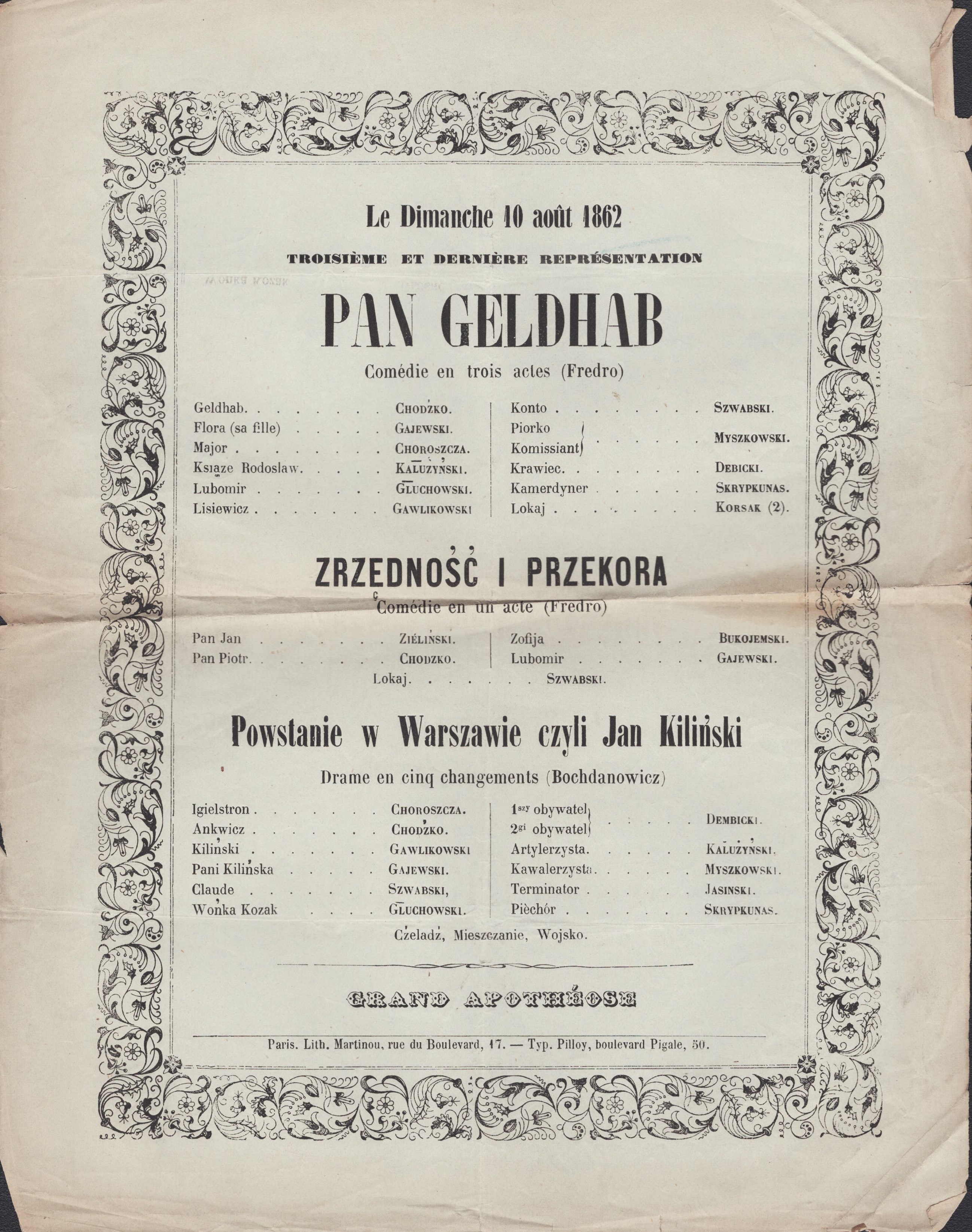 Afisz reklamujący 3 przedstawienia, które odbyły się 10 sierpnia 1862 roku: Pan Geldhab, komedii w 3 aktach Aleksandra Fredry; Zrzędność i przekora, komedii w 1 akcie Aleksandra Fredry; Powstanei w Warszawie czyli Jana Kiliński, dramat w 5 zmianach (Bochdanowicza).