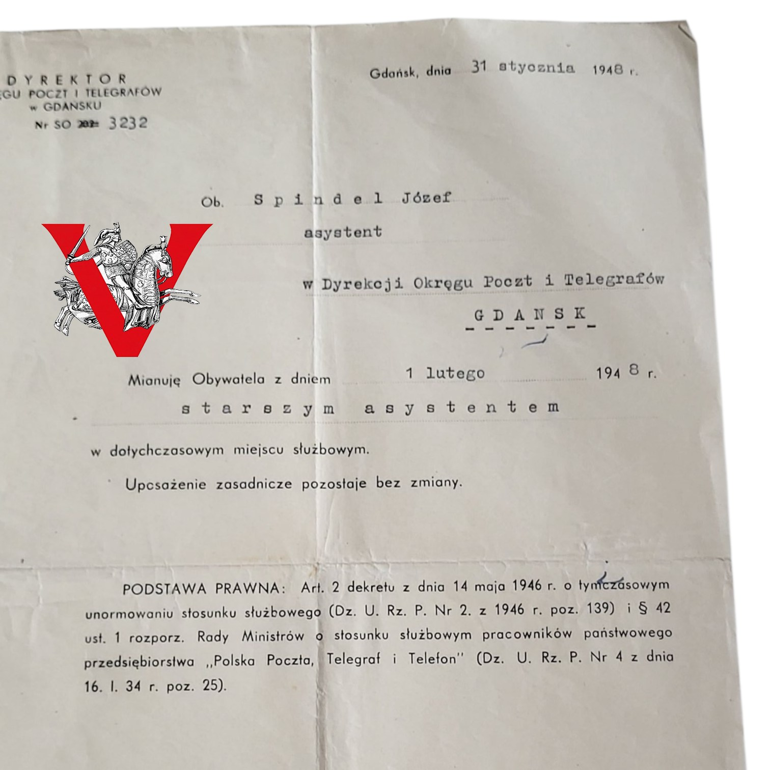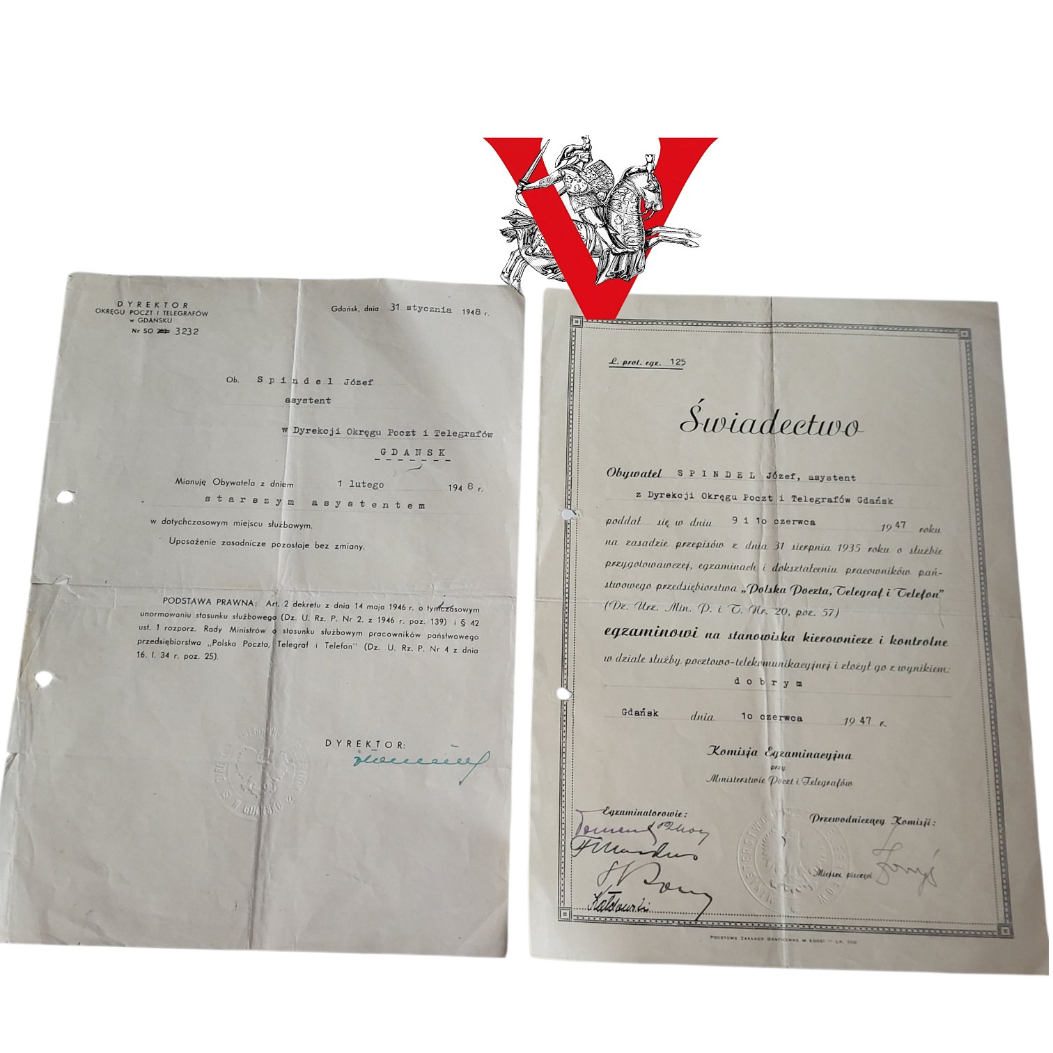 Zestaw dwóch urzędowych dyplomów dotyczących jednej osoby – Józefa Spindla, pracownika Polskiej Poczty, Telegrafu i Telefonu w Gdańsku.
