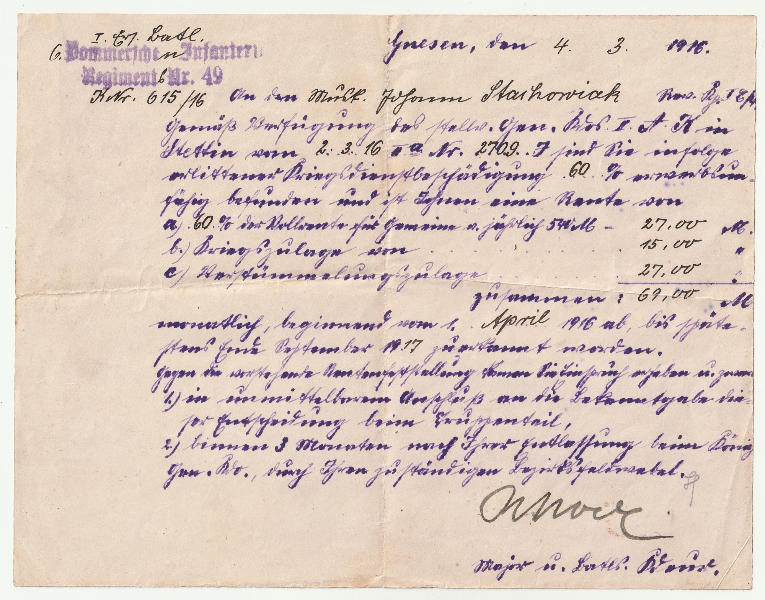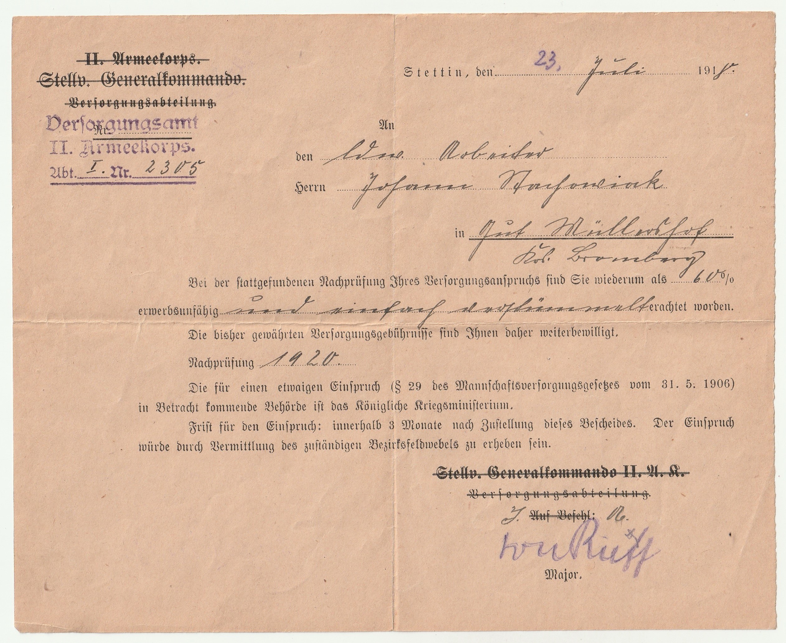 W skład zestawu wchodzi: 1) pismo odręczne w jęz. niem. (Gniezno 4.03.1916) ze stemplem: Pommersche Infanterie Regiment Nr 49 (mowa w nim o Johannie Stachowiaku); ślady złożeń, zagięcie lewego dolnego narożnika, plamki, st. db.; wym. ok. 210x163 mm; 2) pismo wysłane ze Szczecina 23.07.1918 ze stemplem nadawcy: Versorgungsamt II Armeekorps, do J. Stachowiaka, druk z odręcznymi dopiskami, na dole odręczny podpis, ślady złożeń, wym. ok. 205x168 mm; 3) Pismo Wydziału zaopatrzenia II Korpusu Armii wystawione w Szczecinie 7.10.1918 dla Jana Stachowiaka, dotyczy przyznania dodatku do renty, druk jednostronny; ślady złożeń, rozdarcia w miejscach złożenia, zabrudzenia i drobne zagięcia narożników, st. db.; wym. ok. 218x170 mm; 4) pismo (maszynopis) z Berlina 09.04.1937 od Centralnego Biura Wywiadowczego dla strat osób wojskowych i grobów poległych (na dole stempel Zentralnachweiseamt für Kriegerverluste und Kriegergräber) z 9.04.1937 odnoszące się do służby w niemieckiej armii Wehrmanna Franza Stachowiaka w latach 1914–1916, zwolnionego ze służby 19.10.1917, ślady złożeń, drobne rozdarcia w miejscach złożenia, wym. ok. 210x295 mm.