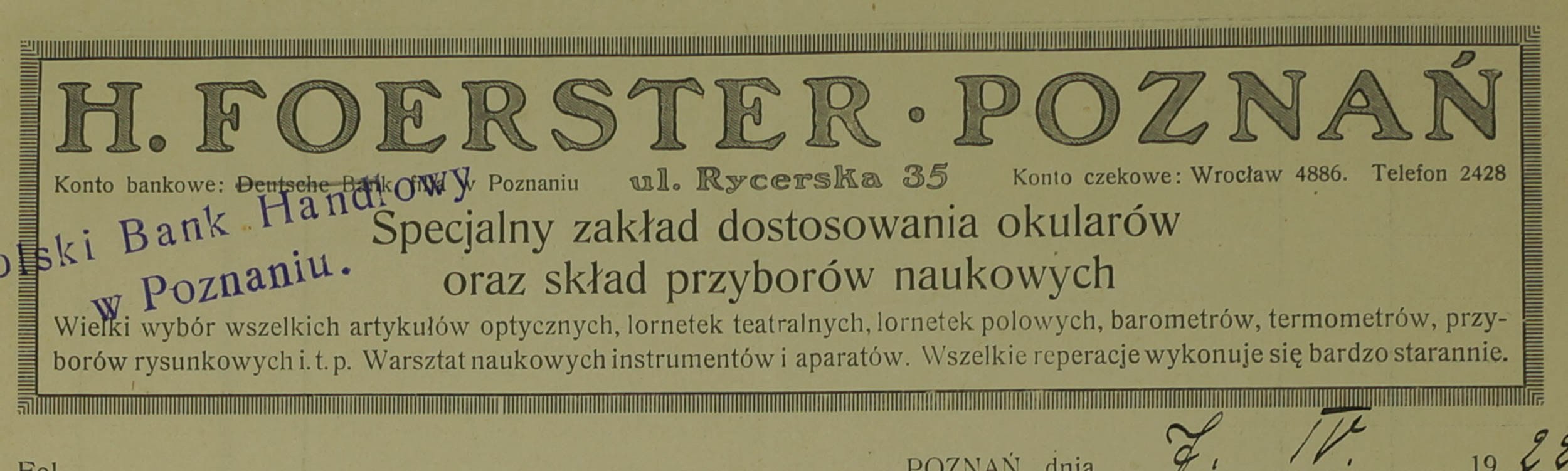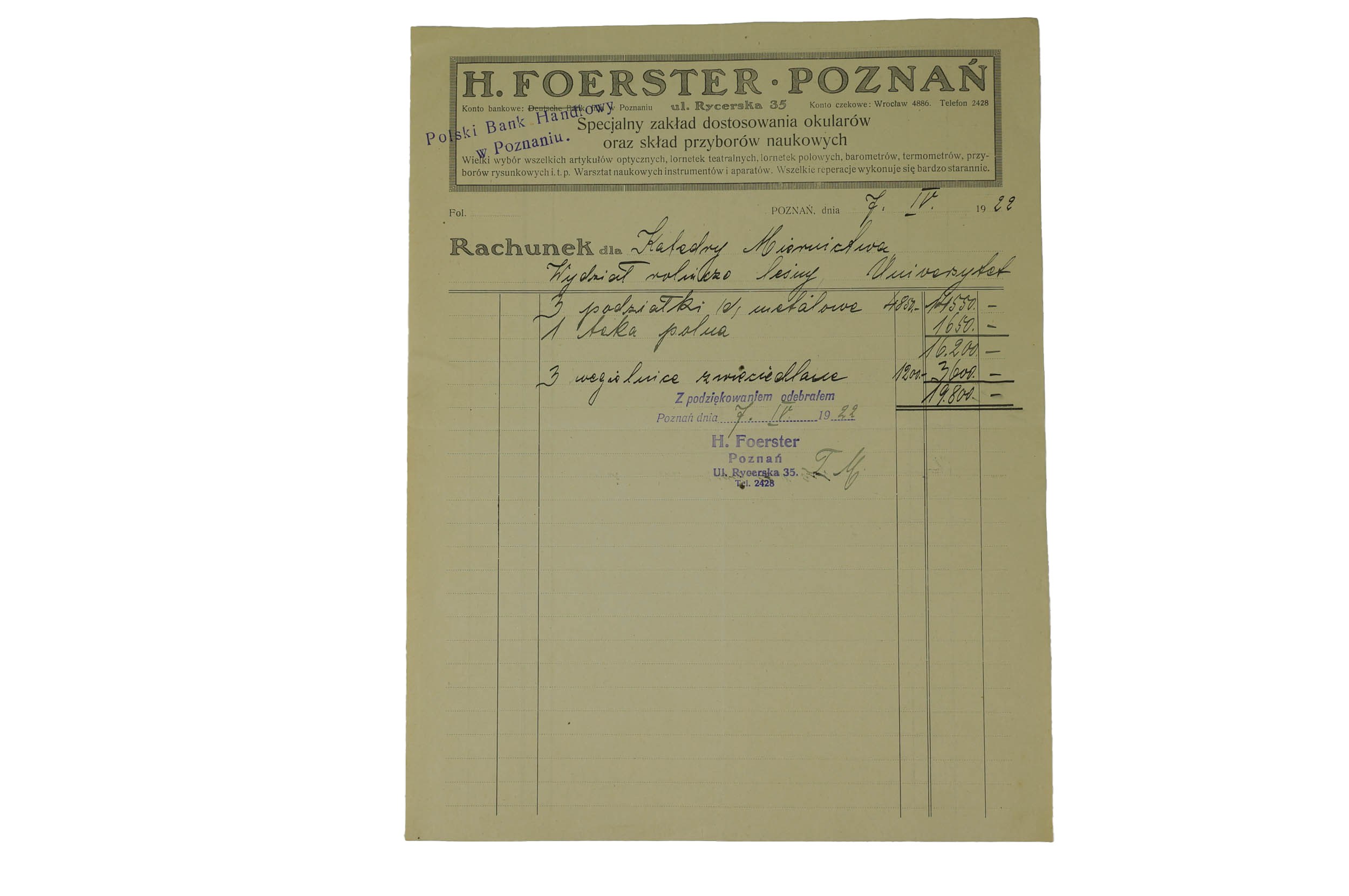 H. Foerster Specjalny zakład dostosowania okularów oraz skład przyborów naukowych, Poznań ul. Rycerska 35, RACHUNEK dla Katedry Miernictwa Uniwersytetu Poznańskiego na podziałki metalowe, tekę palną i węgielnice zwierciadlane datowany 7.IV.1922r., druk z nagłówkiem firmowym, wypełniany odręcznie ze stemplem firmowym, f. 22,7 x 29cm