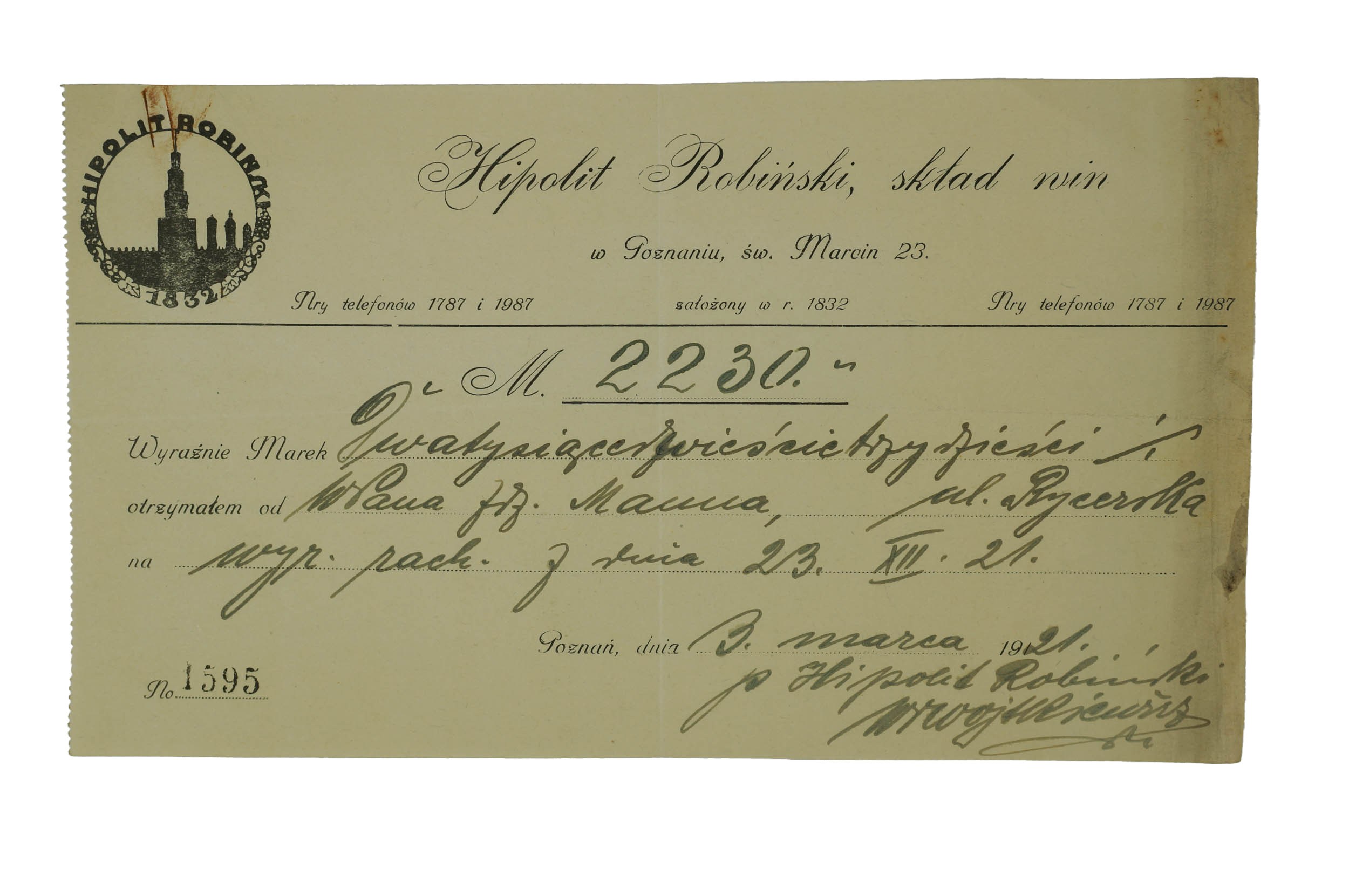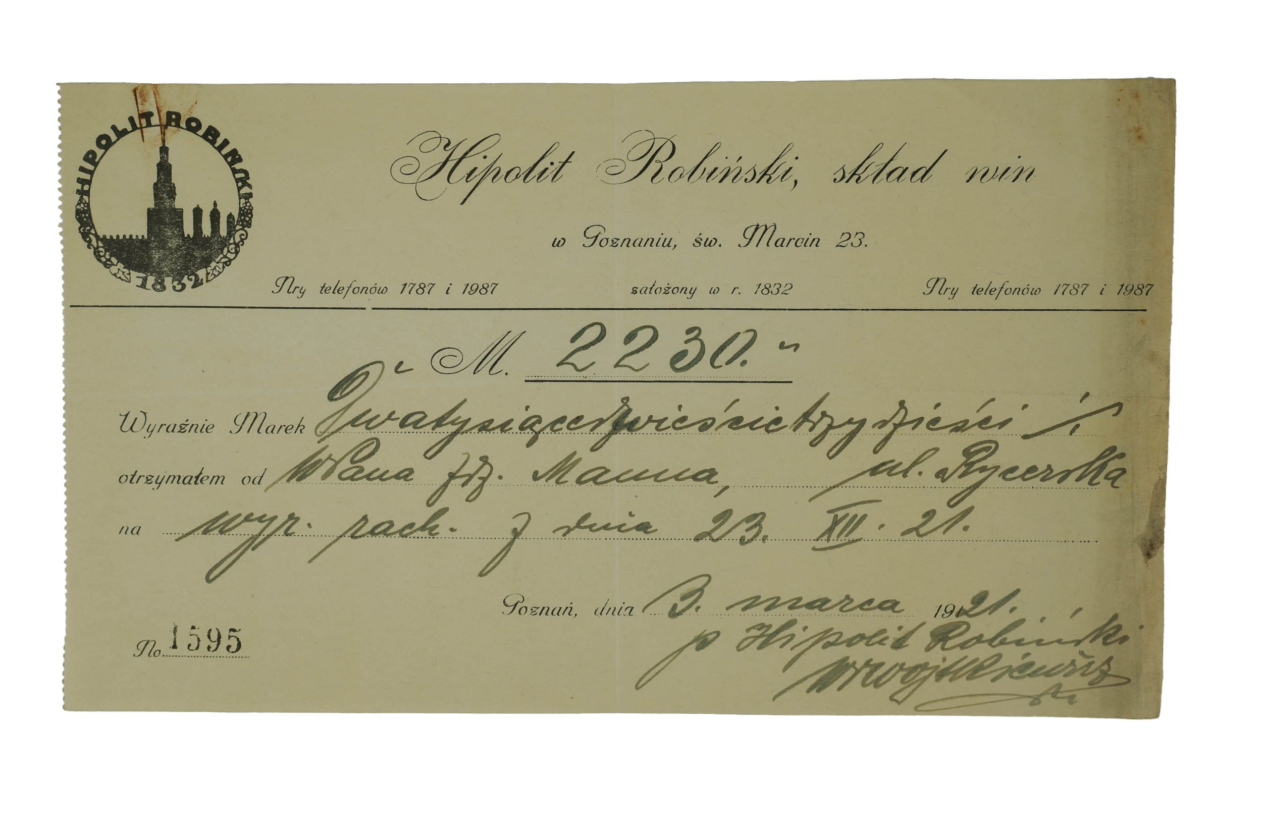 Hipolit Robiński Skład win w Poznaniu KWIT ZAPŁATY na kwotę 2230 marek, datowany 3 marca 1921r., f. 22,5x12,5cm