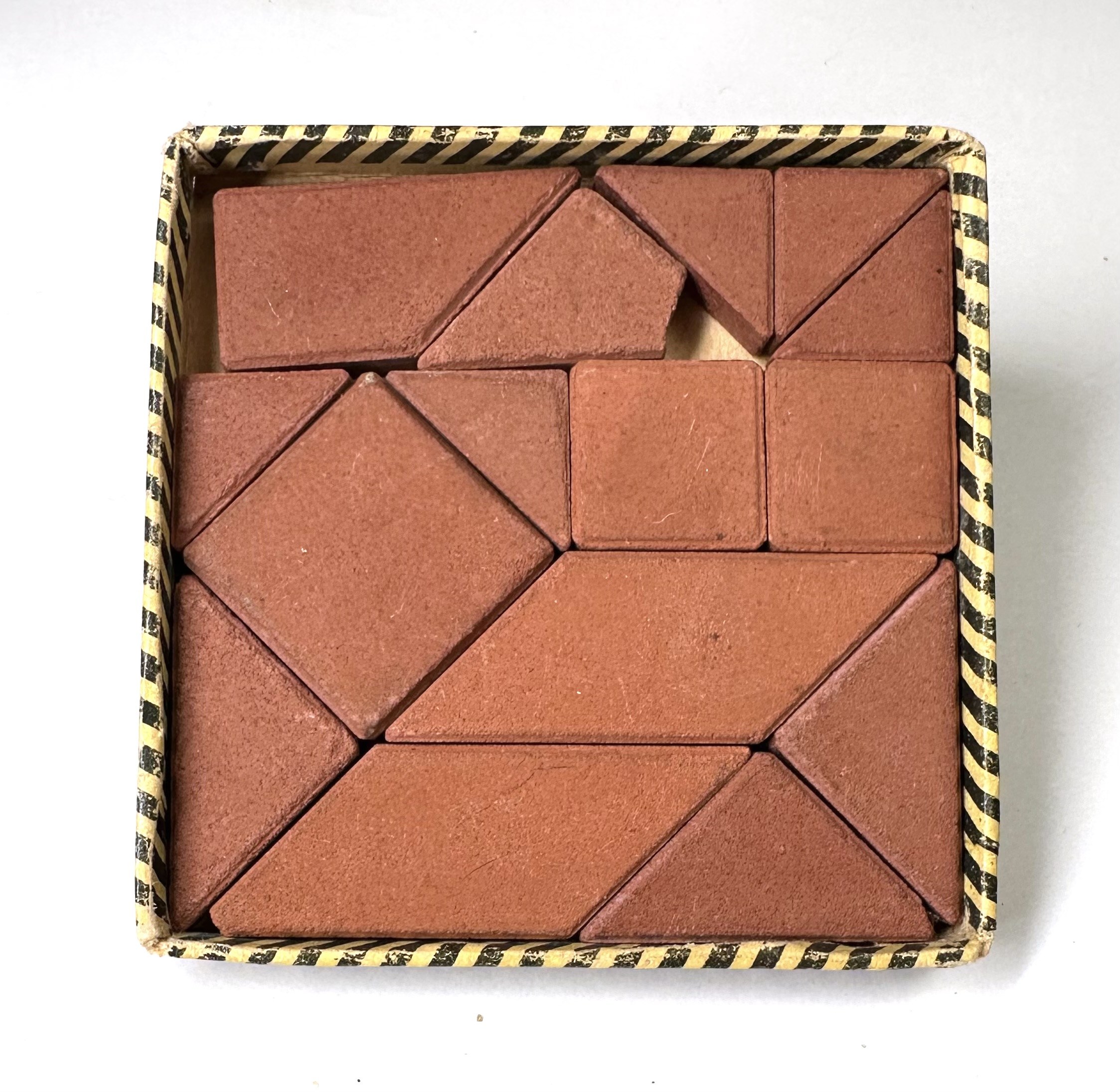 Tekturowe pudełeczko o wymiarach 8x8 cm, na licu tytuł w językach niemieckim, węgierskim, czeskim i polskim, na odwrocie w tychże językach reklama innych zabawek tego typu dla żołnierzy, wewnątrz 15 kamiennych elementów służących do układania figur geometrycznych.