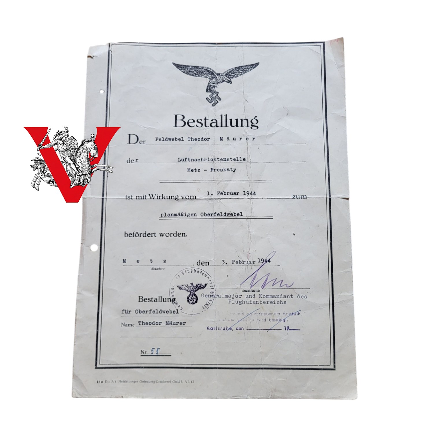 Oryginalny dokument z okresu II wojny światowej – Bestallung (nominacja) wystawiona 3 lutego 1944 roku w miejscowości Metz (Frescaty). Dokument potwierdza awans Feldwebla Theodora Mäurera na stopień Oberfeldwebla w jednostce Luftnachrichtenstelle (łączności lotniczej Luftwaffe). Pismo opatrzone jest pieczęcią z niemieckim orłem Luftwaffe oraz odręcznym podpisem generała – komendanta obszaru lotniskowego (Flughafenbereich).