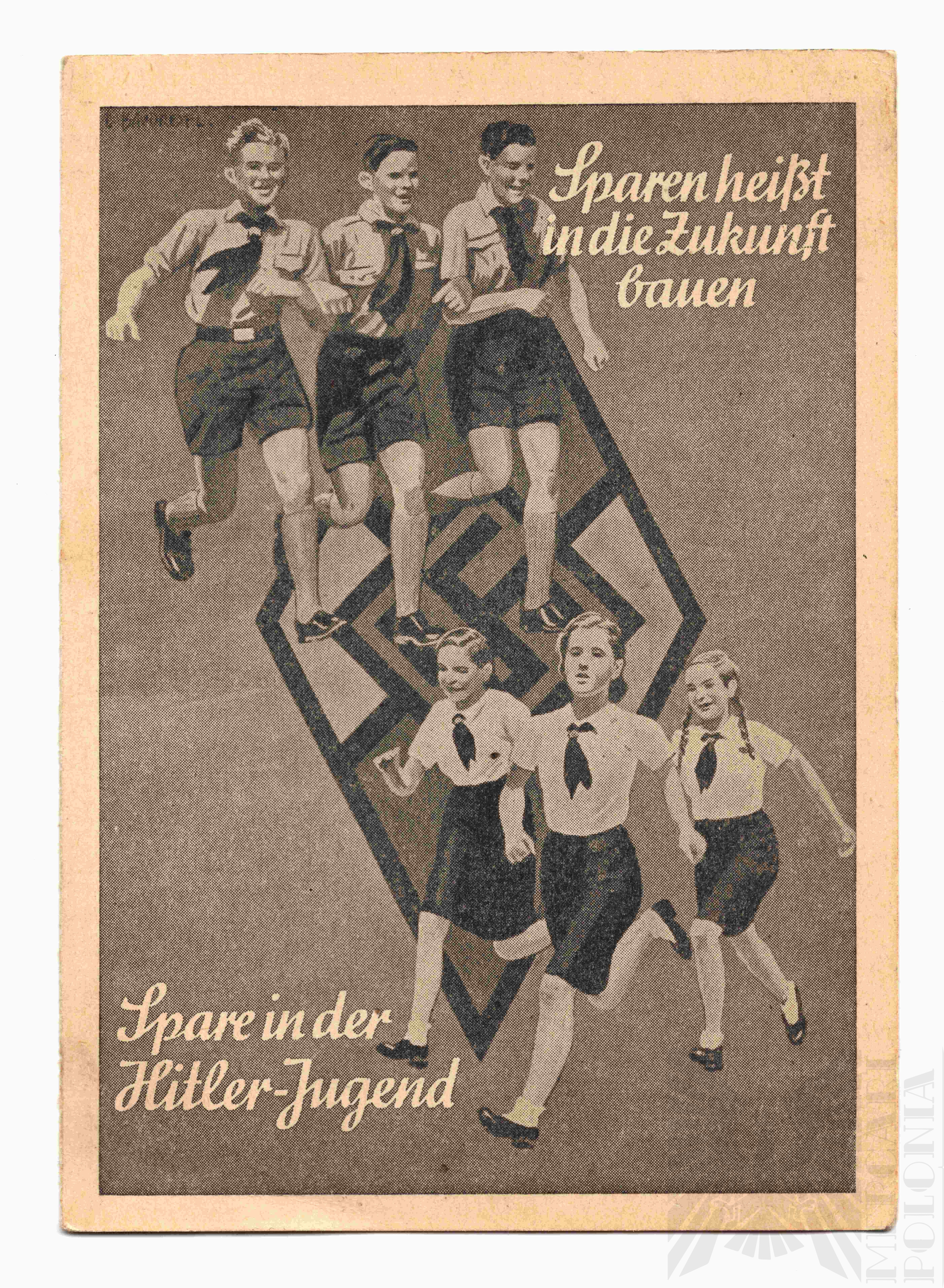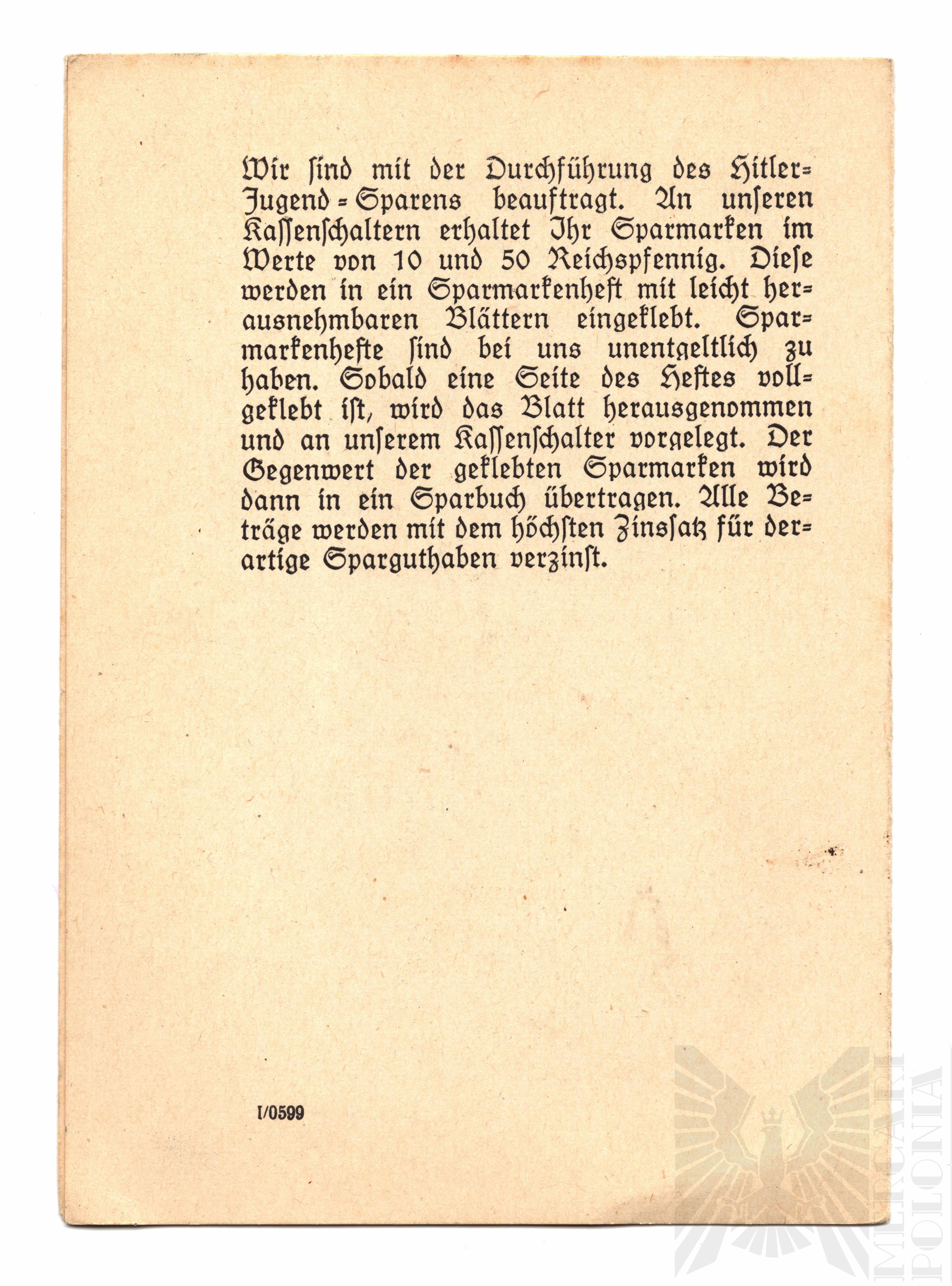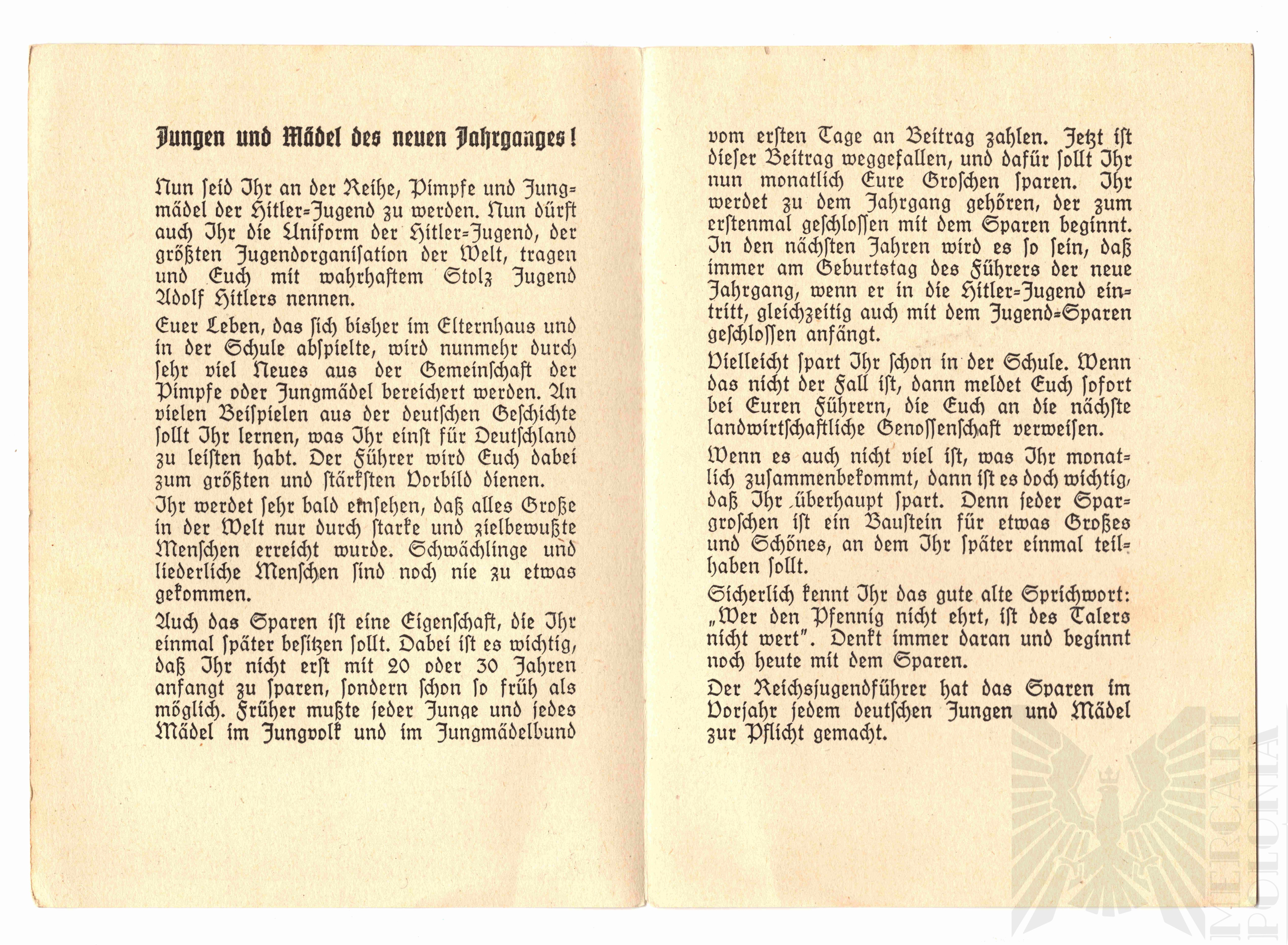 Dokument, będący materiałem propagandowym Hitlerjugend, zachęca młodzież do wstąpienia do organizacji oraz do wczesnego i systematycznego oszczędzania. Podkreśla rolę Führera jako wzoru, a oszczędzanie przedstawia jako obowiązek młodego Niemca. Dodany fragment opisuje techniczne zasady programu oszczędnościowego: młodzież kupuje znaczki oszczędnościowe, wkleja je do darmowej książeczki, a wypełnione strony wymienia w kasie na przelew na konto oszczędnościowe, oprocentowane według najwyższej dostępnej stopy.