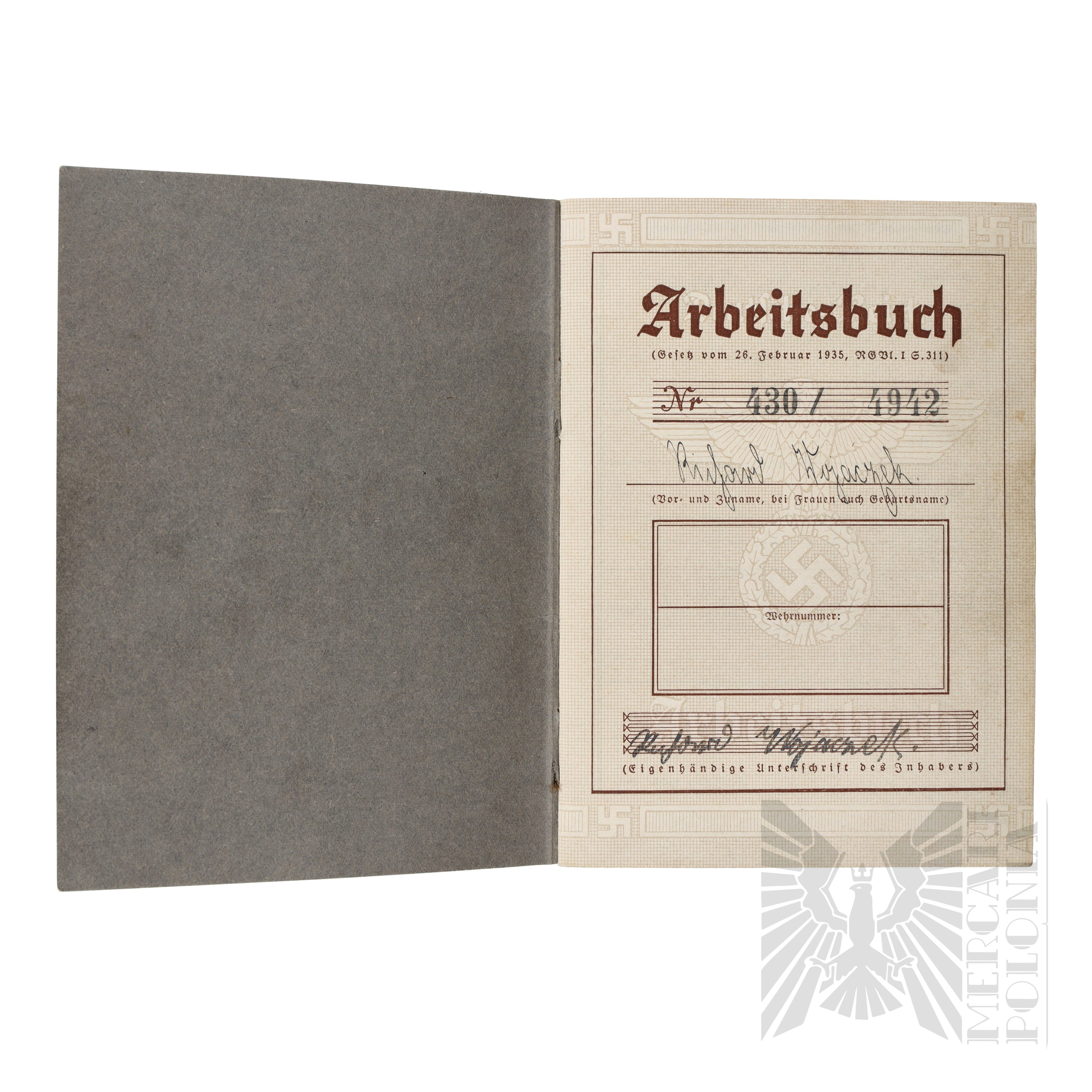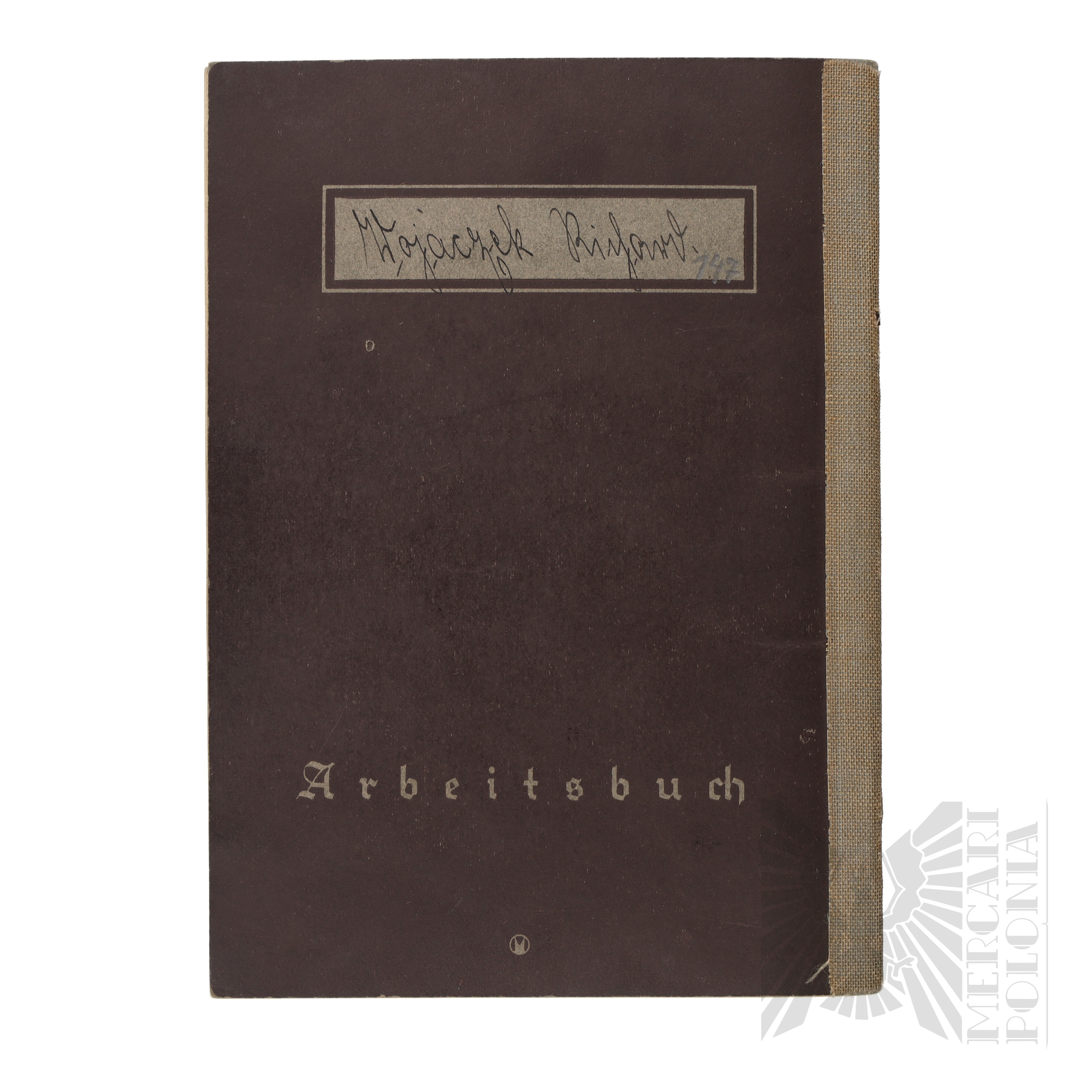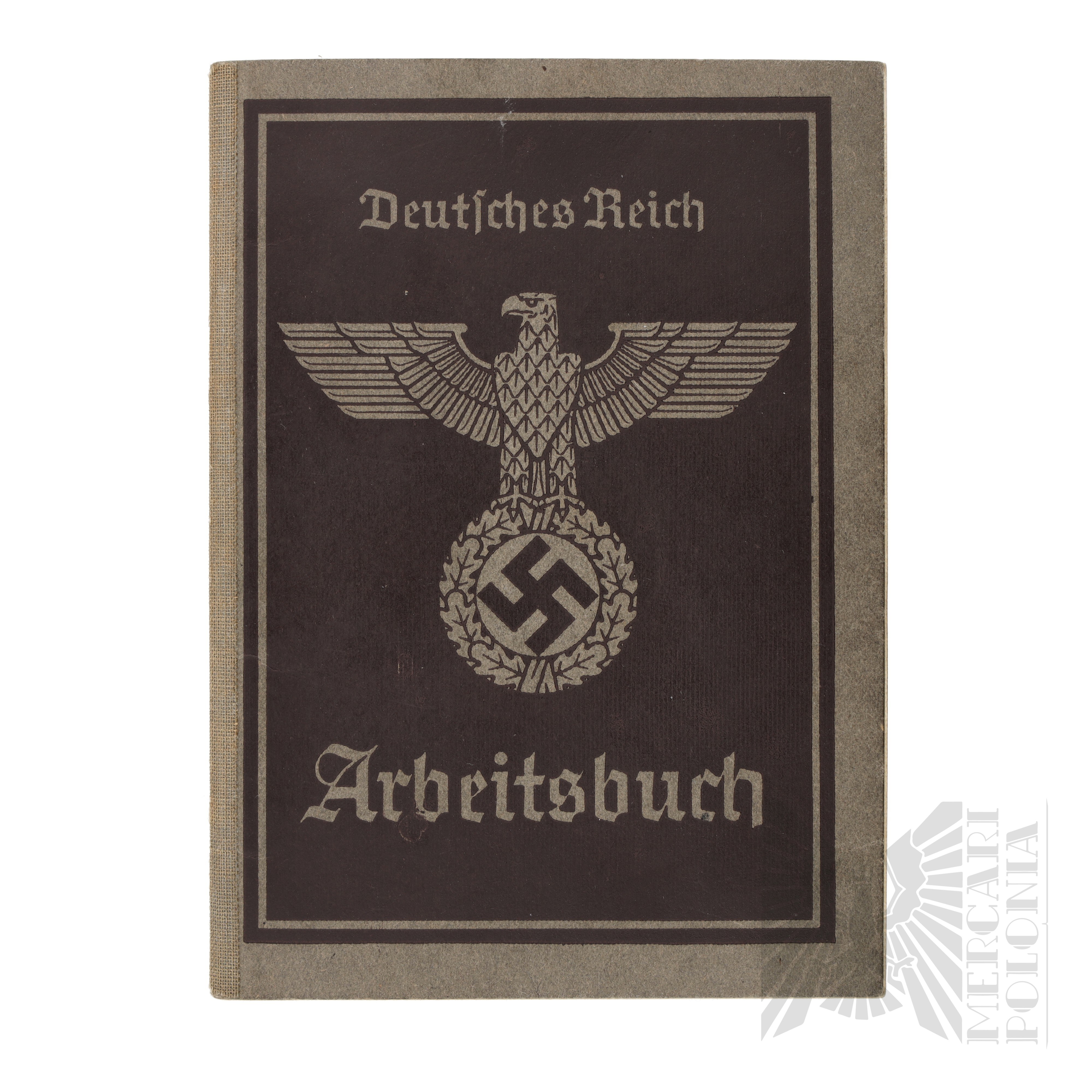 Arbeitsbuch (Książeczka Pracy) był dokumentem kontrolującym mobilność zawodową pracowników. Jego posiadanie było obowiązkowe przy zatrudnieniu, a zmiana pracy wymagała zgody poprzedniego pracodawcy. Ograniczał wolność zawodową, a od 1935 roku służył także jako narzędzie regulacji rynku pracy w ramach Planu Czteroletniego. Książeczka została wystawiona na Pana Ryszarda Wojaczka w 1940 roku. Zawiera informacje odnośnie bieżącego miejsca pracy oraz byłych miejsc zatrudnienia.